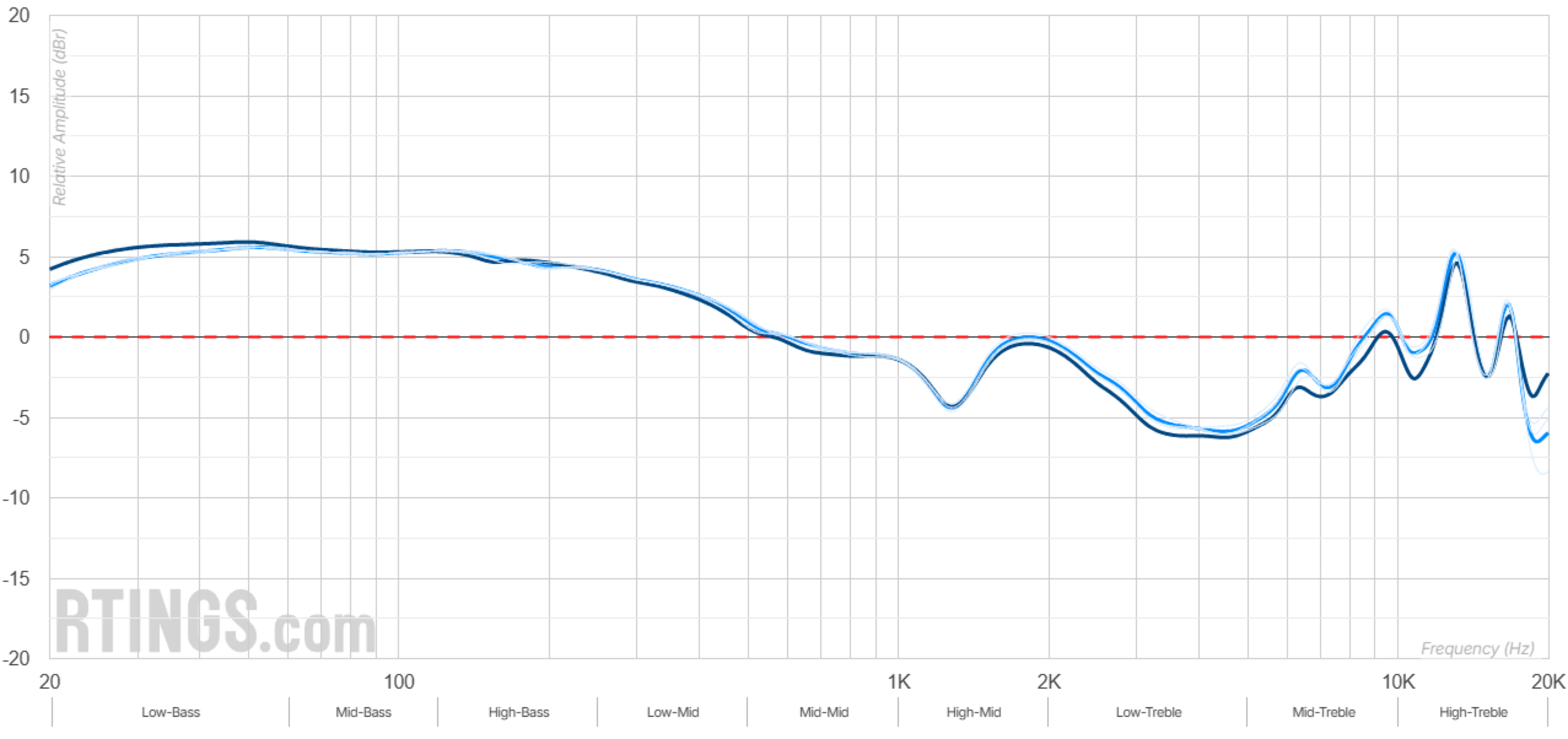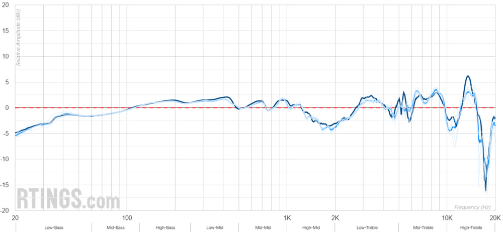 We also separate out changes that come from how the headphones sit on your head. That's what Frequency Response Consistency (FRC) is for. Headphones sound different on different people because of the way they interact with the wearer's personal characteristics, like the size of their head or whether they wear glasses. That variation is reflected in the FRC score. If our Peaks/Dips test measures irregularities in the frequency response itself, FRC measures the way that the perceived frequency response changes across different seatings and different people.