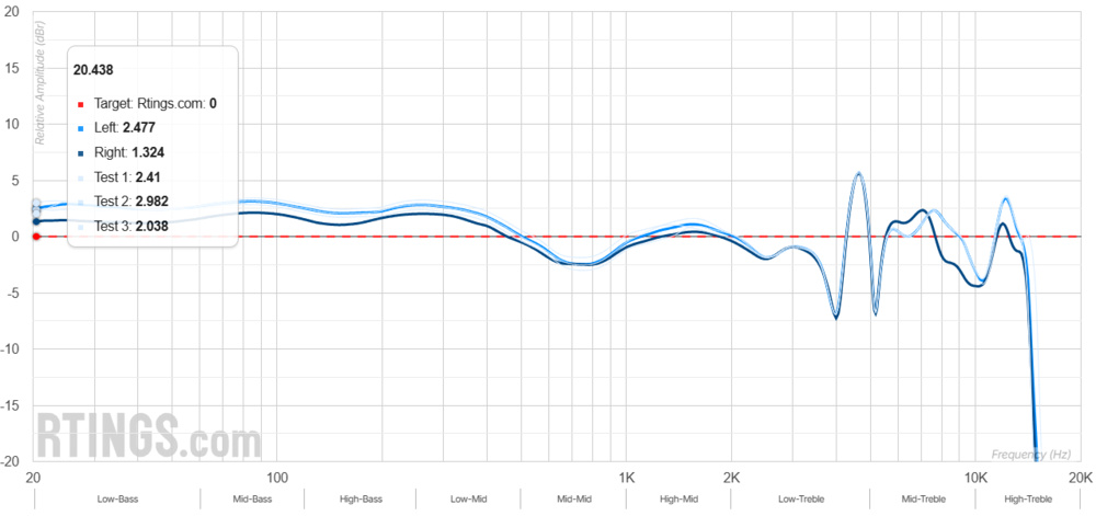 Big differences between the left and right ear cups aren't part of the Peaks and Dips score: they're handled by our Stereo Mismatch test. That measurement looks at how closely the two channels match. If one side of the headphones shows a big spike or dip that the other doesn't, it usually points to a driver imbalance or a quality control issue. You can visually see the differences between the left and right drivers on the Peaks/Dips graph, but those differences are only scored in the Stereo Mismatch test.