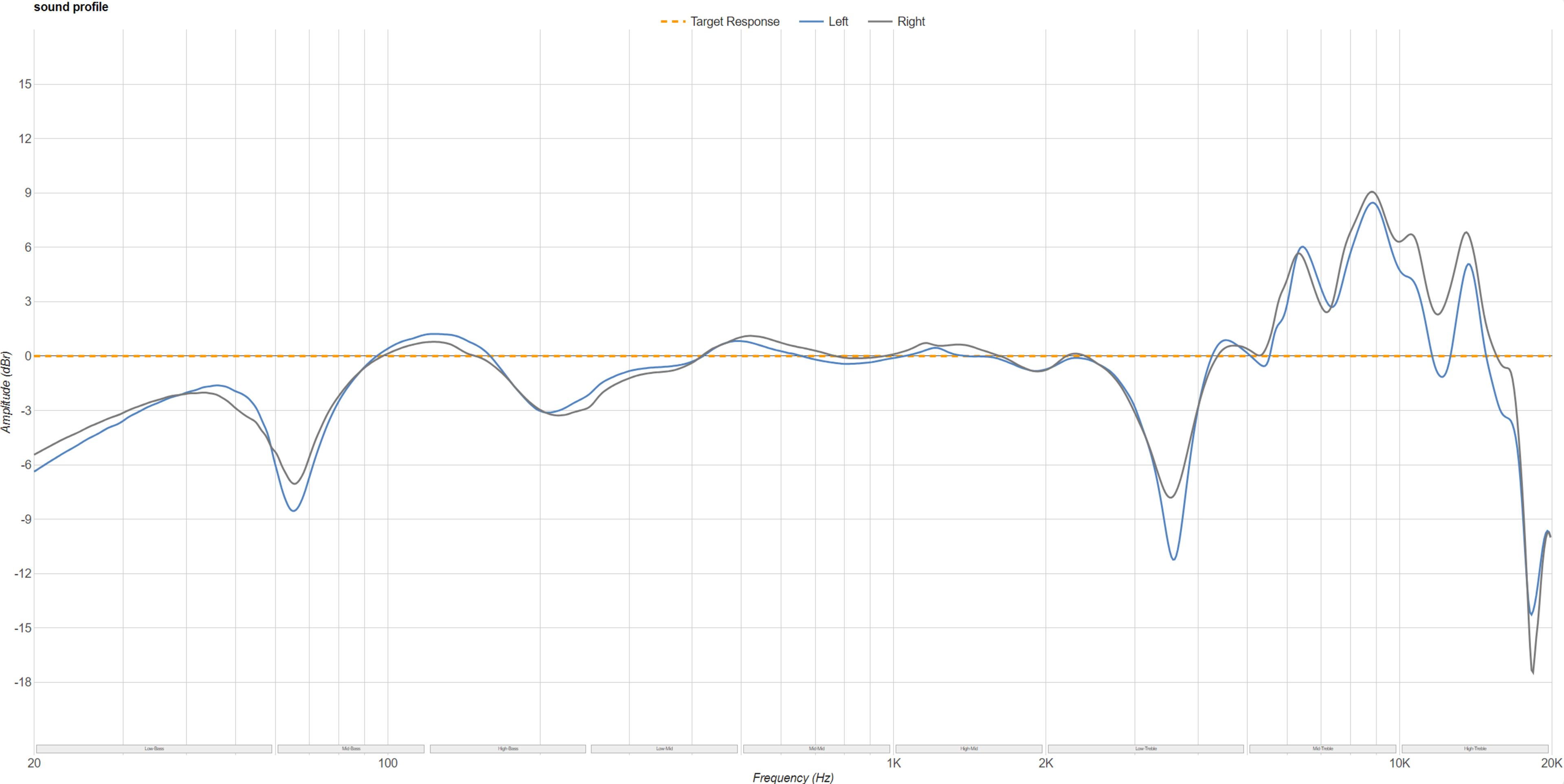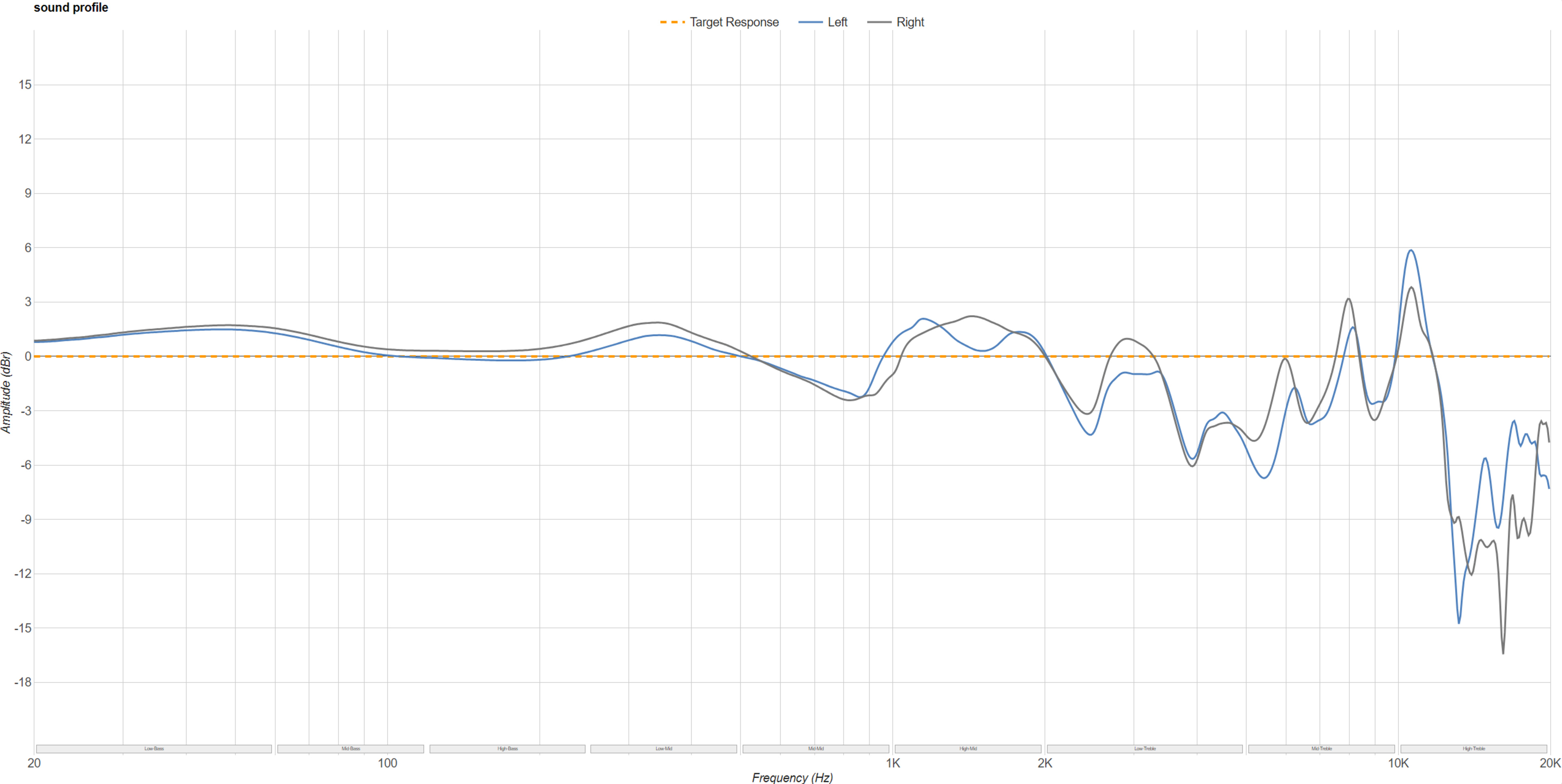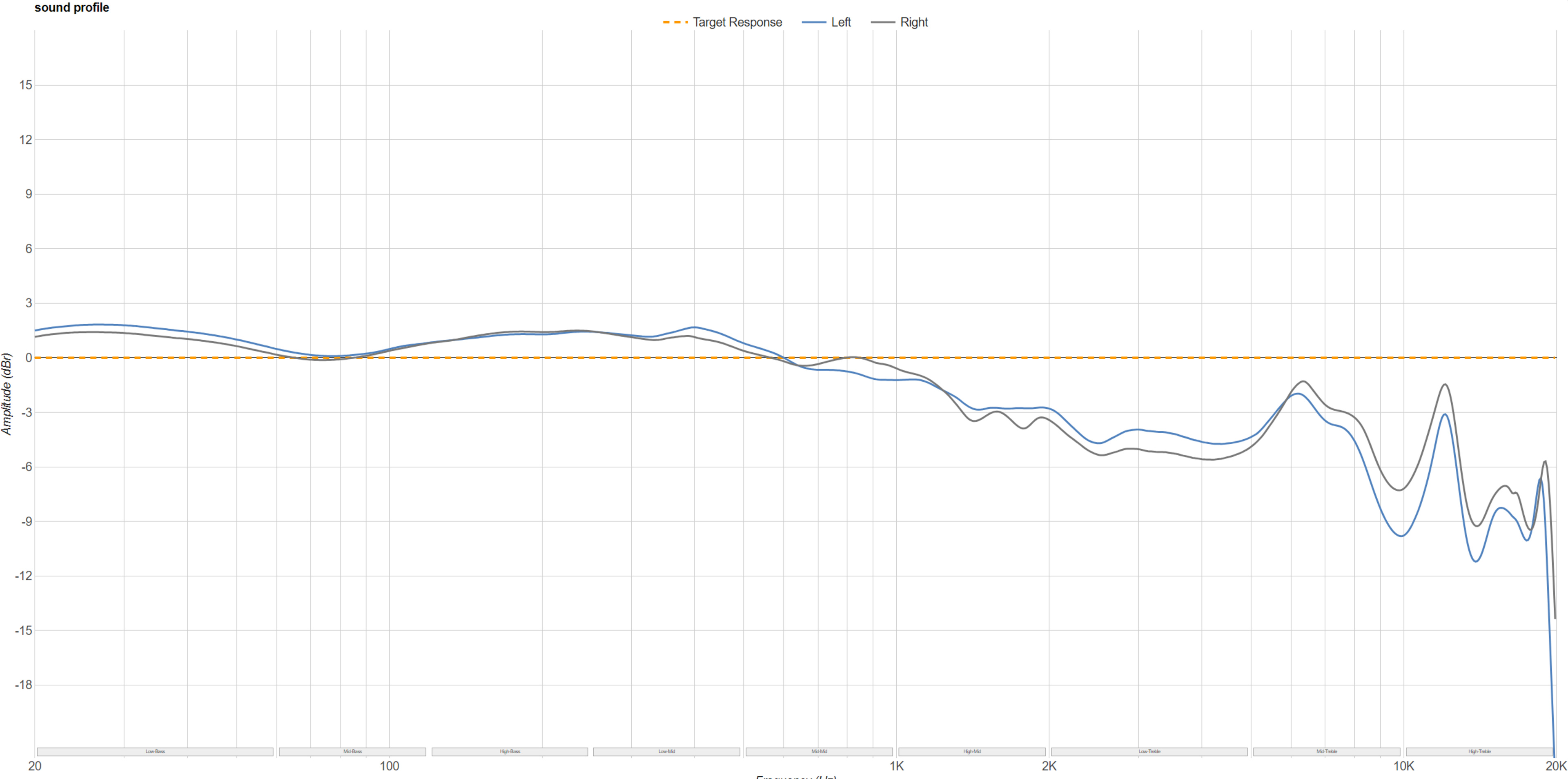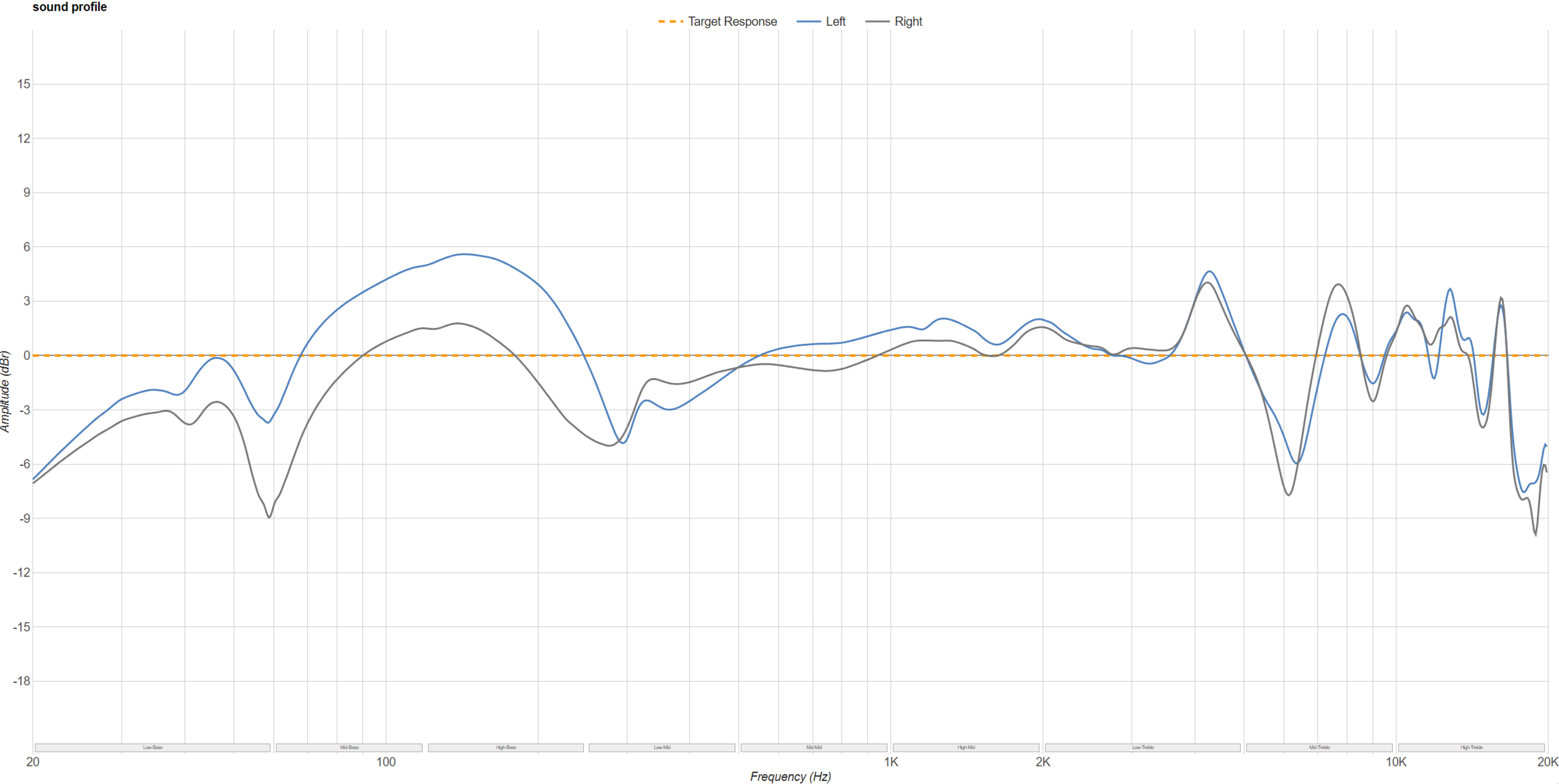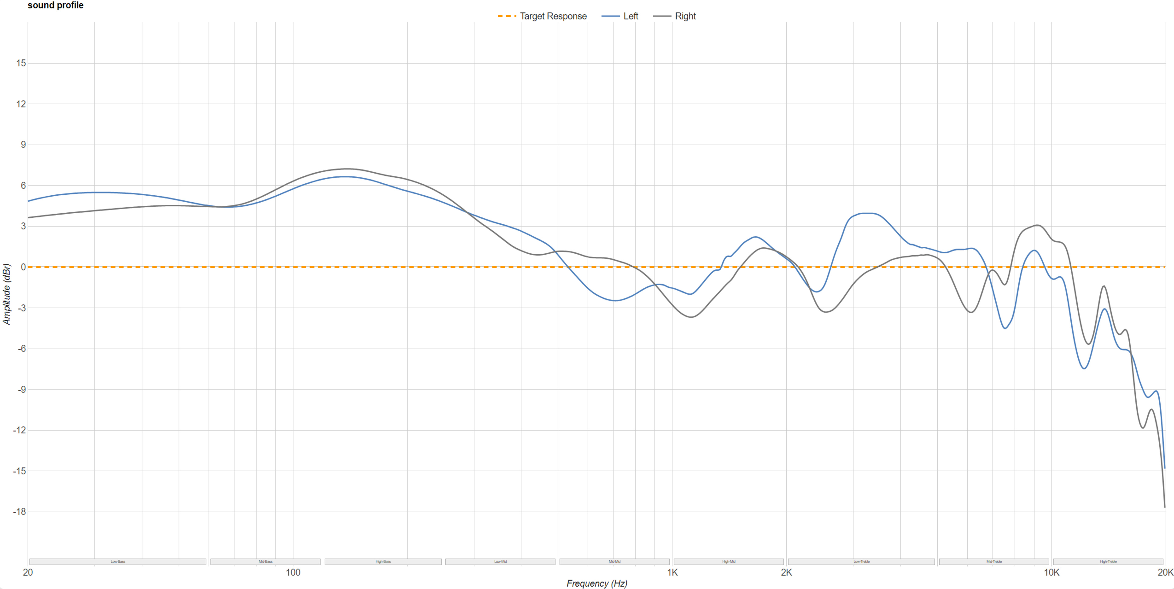 Our Sound Profile test is a more novice-friendly sibling of Raw Frequency Response. This test makes it easier to see how the frequency response deviates in relation to our target curve. Target curves are representations of what most people consider 'good sound' based on research and data. While there are a few out there, in our own case, we use a target inspired by research conducted by Harman1,2,3 and informed by other studies in the audio industry4. These works are based on how sound reaches your ears when using good speakers in a semi-reflective room. If you want to get into the details of our target curve, you'll want to check our R&D article, which further explores our process of defining our target curve and the pitfalls therein. We'll keep things a little more surface-level for the rest of the article.