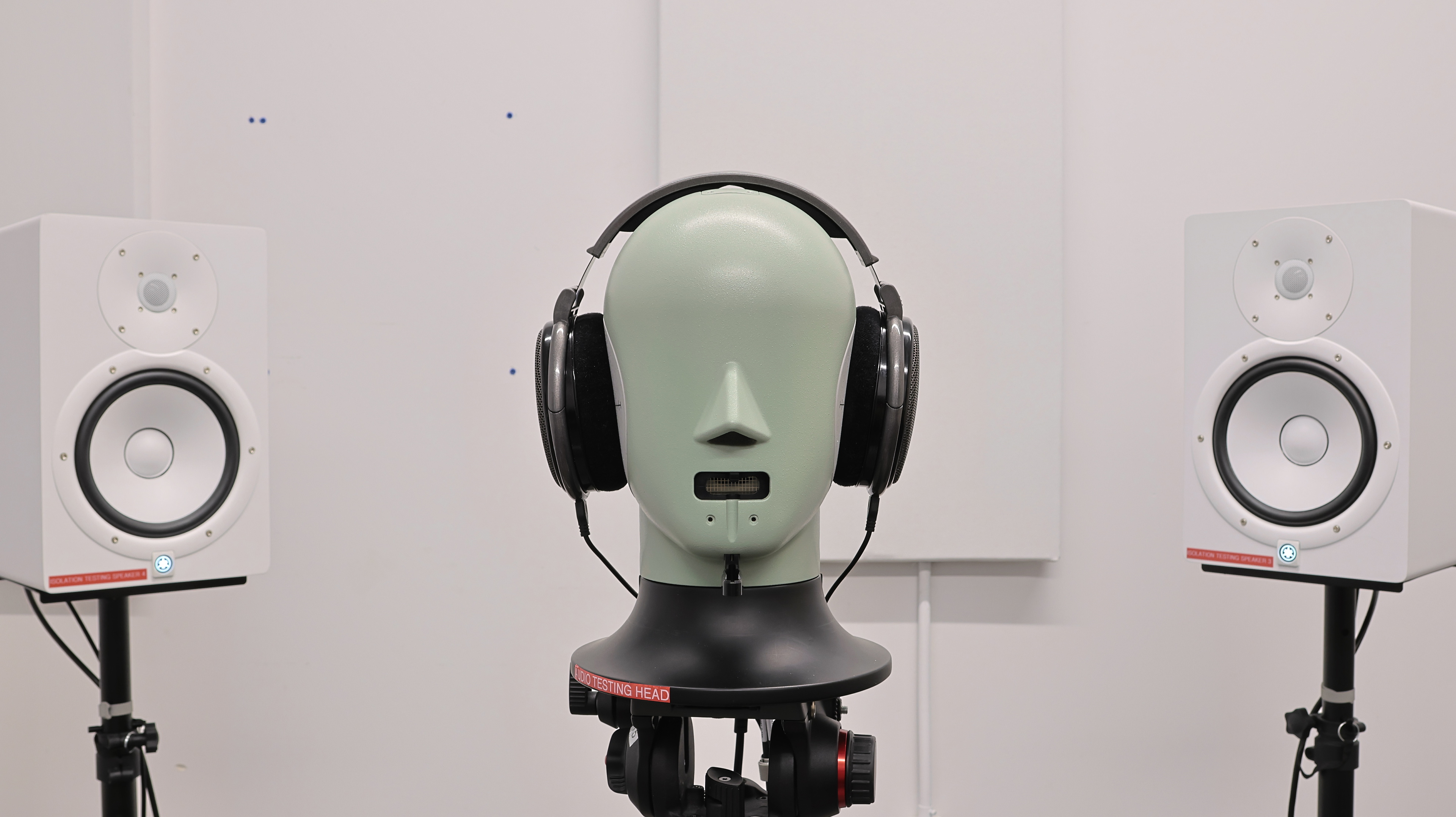 To create our sound profile graph, we must first measure the raw frequency response. We use a Brüel & Kjær HATS Type 5128-B (B&K) measurement rig in a room with low ambient noise and minimal sound treatment. We position the headphones on our artificial head and calibrate the testing levels using a 500Hz test tone, which is adjusted to produce 94 dB SPL for the specific headphone model in testing. This calibration adheres to the IEC 60268-7 standard for headphone and earphone testing, ensuring that our results are consistent with manufacturer specifications and other published frequency response graphs that follow this standard.
