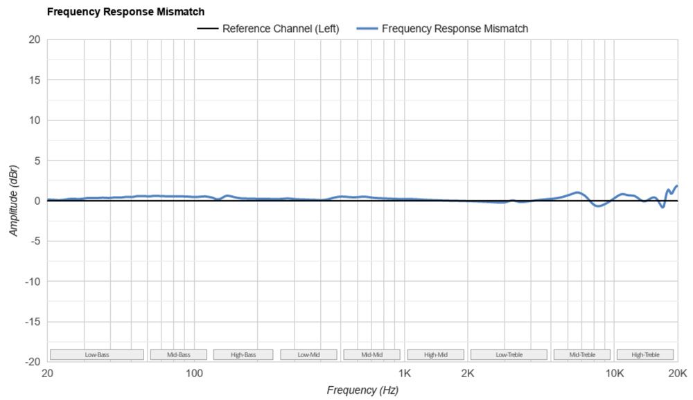 This test assesses the amount of difference or standard deviation between the frequency response produced separately by a unit's left and right drivers. This mismatch results in an uneven stereo image where some frequencies are skewed to the left or right instead of being centered. Frequency response mismatch is similar to amplitude response mismatch, as in they look for the same kind of error, but frequency mismatch does it per frequency, as opposed to amplitude mismatch, which does it per channel.