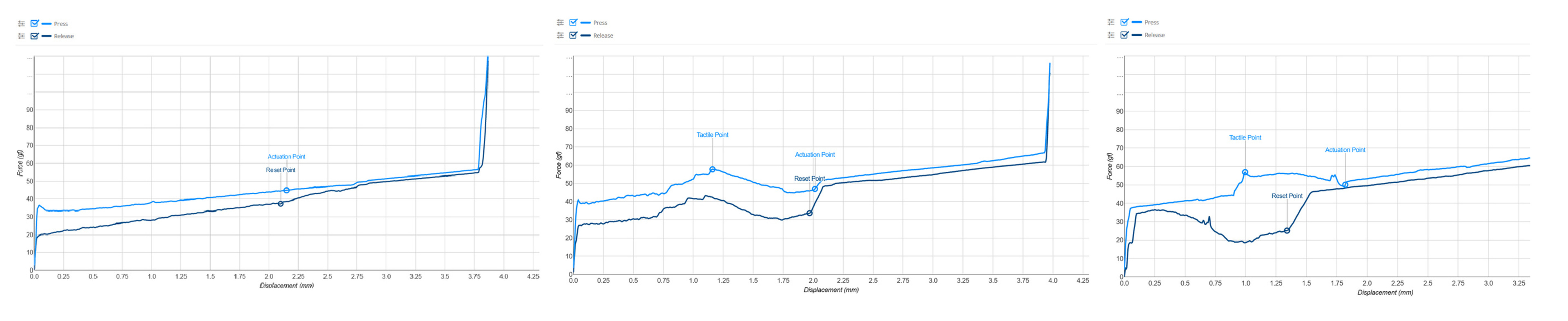 This machine allows us to evaluate fundamental aspects of a switch, including switch feel, actuation force, and total travel distance. We also use it to produce standardized force curve graphs that are widely used by switch enthusiasts to compare and visually understand the differences between switches.