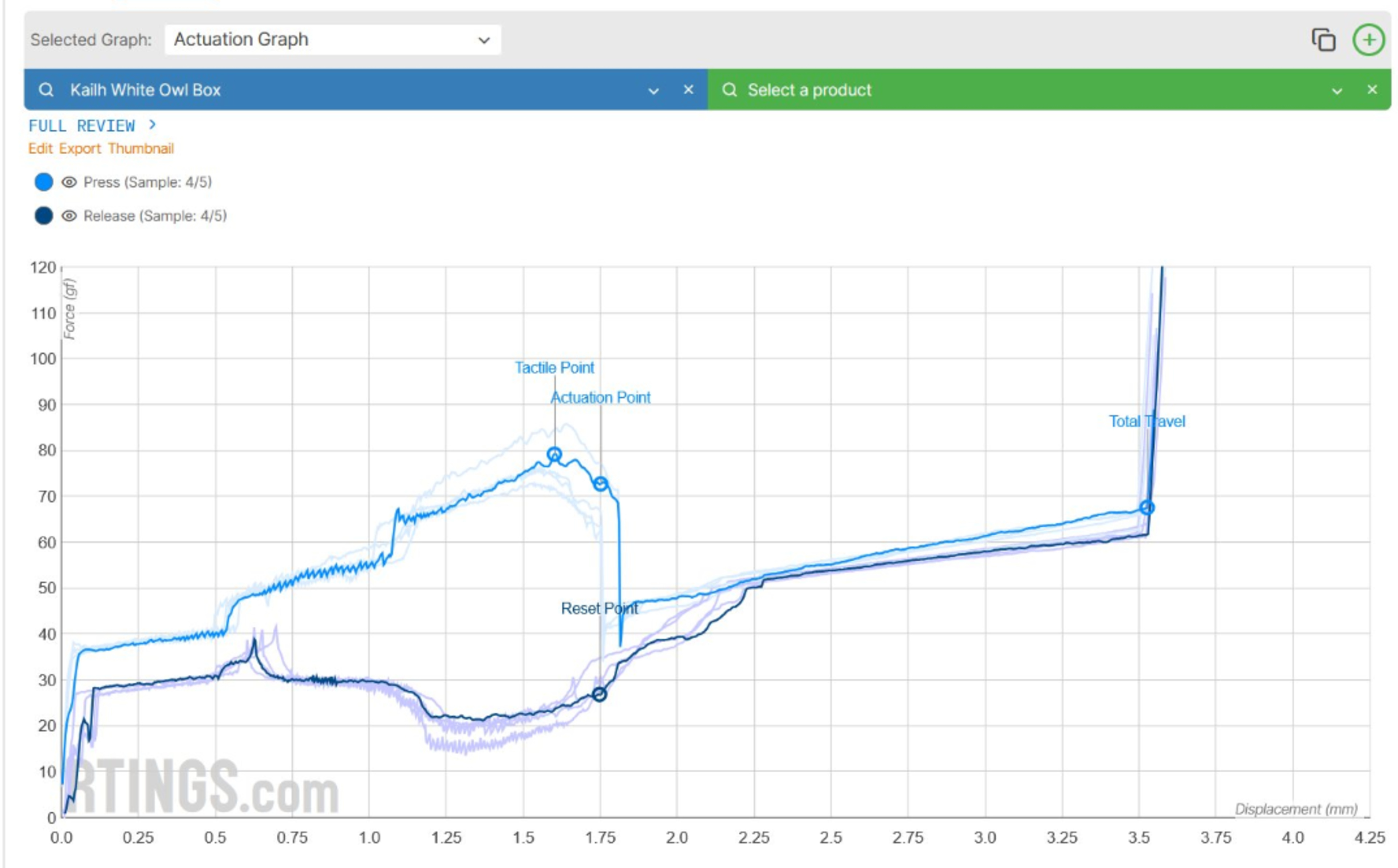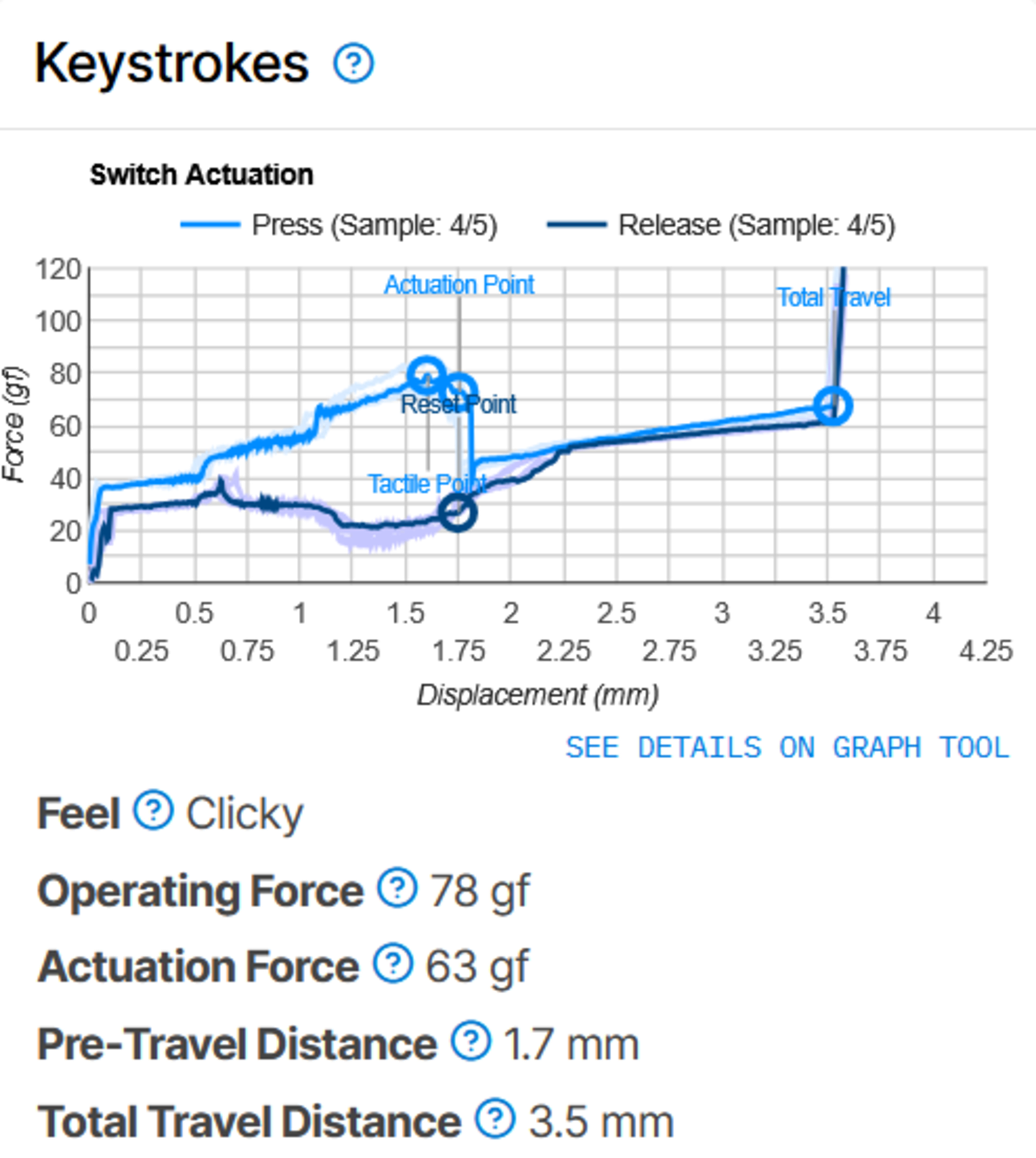 We recognized that the terms we used to describe two of our comparison measurements, Actuation Force and Operating Force, were often used interchangeably by manufacturers and the wider community. This overlap made our results harder to interpret and complicated comparisons with manufacturer specifications or other reviewers' force-curve databases. To address this, we've renamed our Operating Force comparison to Peak Tactile Force.