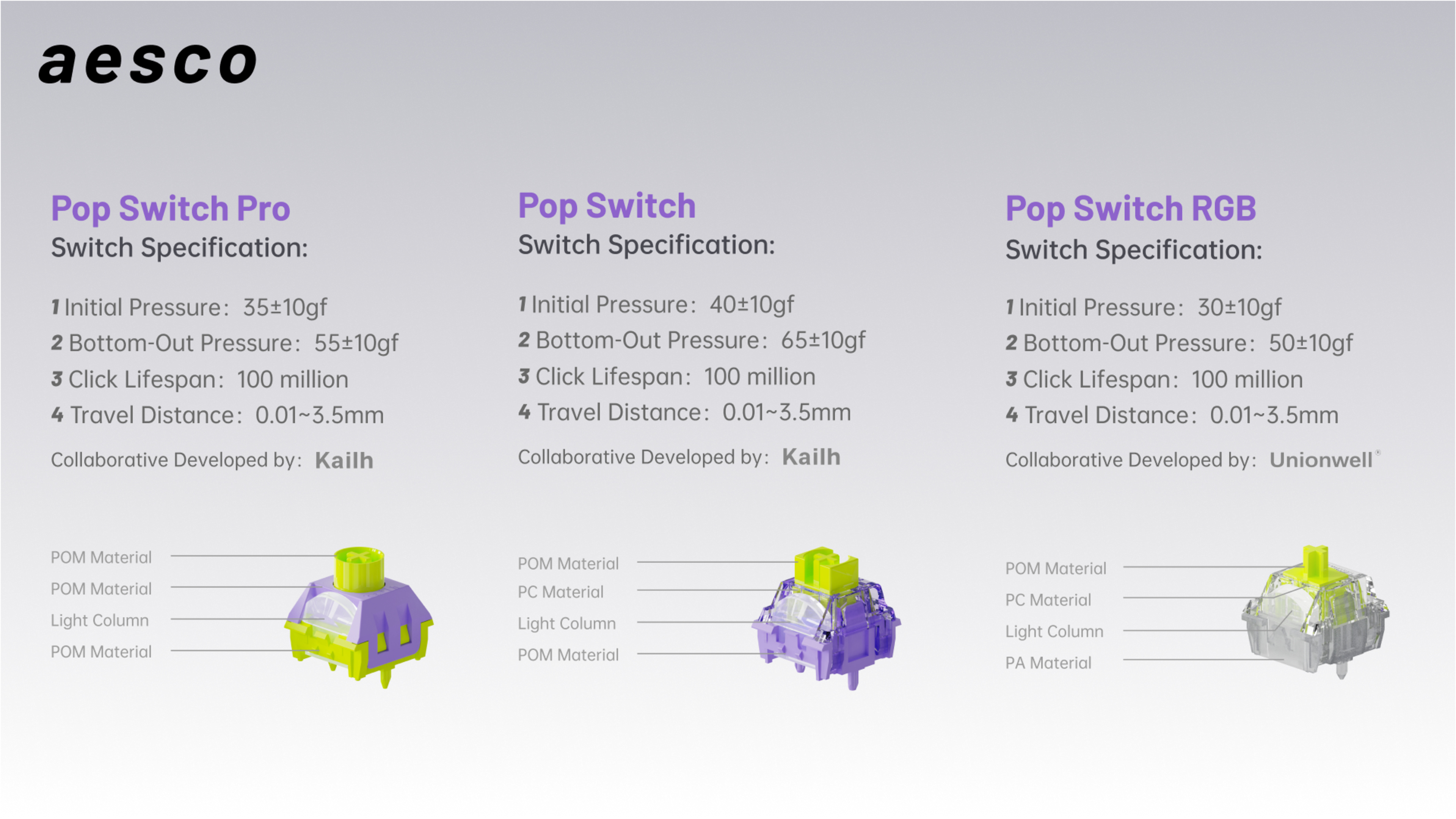 *While some of Aesco's advertising material suggests there are other switch options available, we've only encountered listings available with Kailh Pop Switch Pro switches.