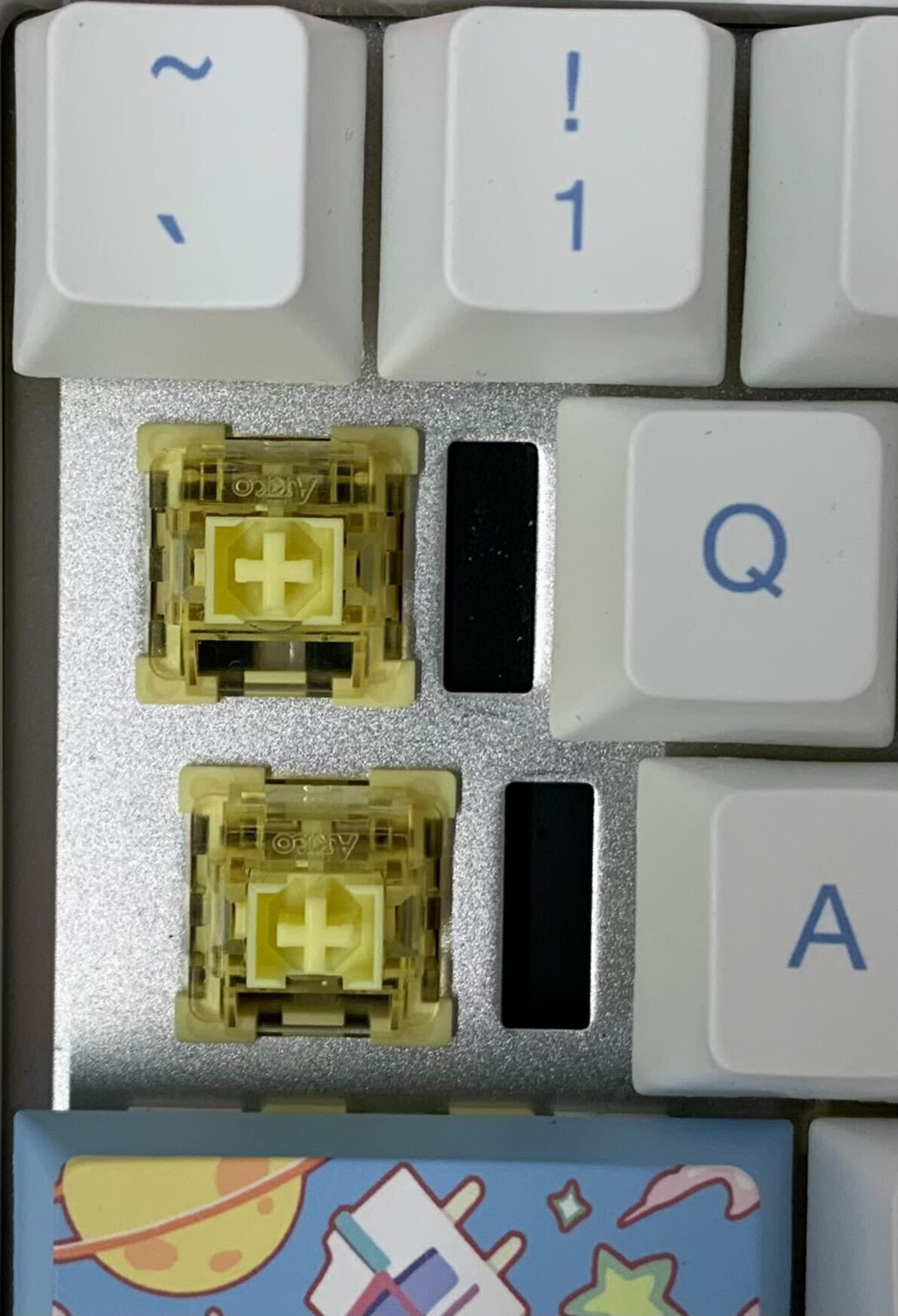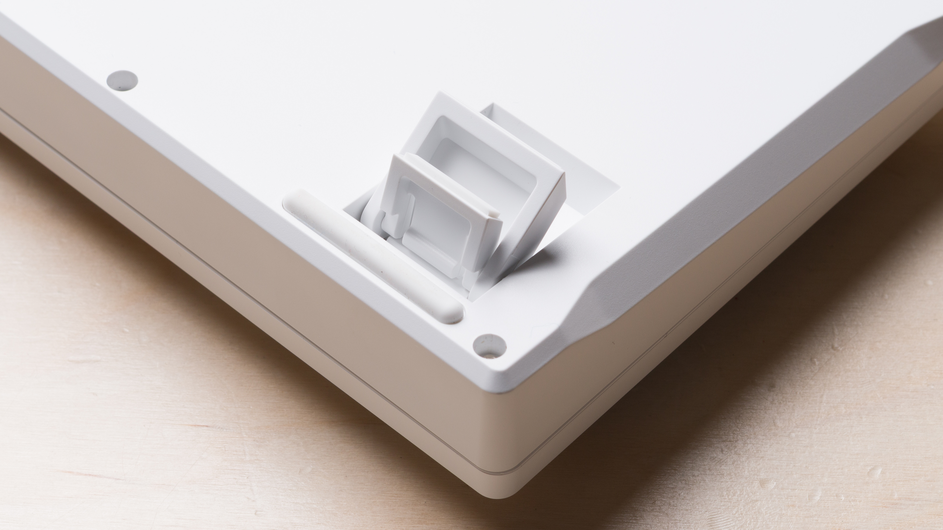 It's a minor detail, but there are three small slots machined through the plate down to the internal foam layers (two near the Caps Lock and Tab keys and one more between the F4 and F8 keys). These gaps can be slightly visible, especially with backlighting on. It's not clear what purpose these slots serve, and they don't impact usability, though they may collect dust and debris and may be irritating if you prefer a cleaner appearance.