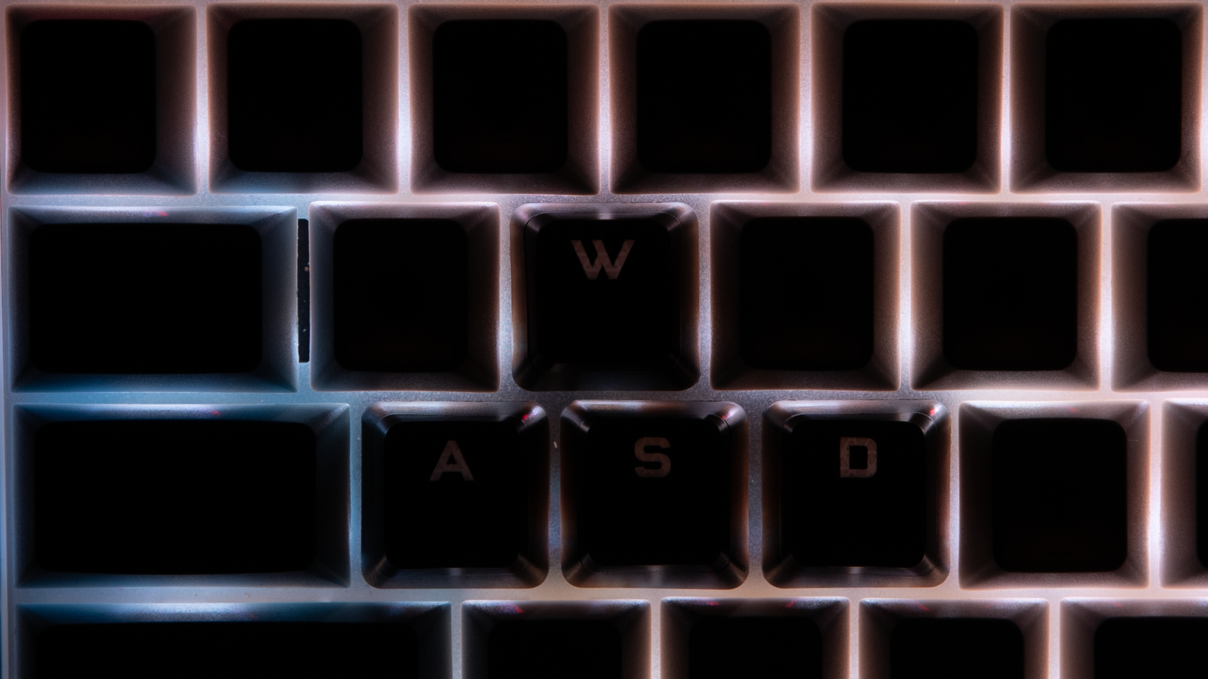 For additional reference, we took a photo with several stock keycaps replaced with standard shine-through keycaps. These shine-through keycaps are designed for north-facing backlighting, and as you can see, the visibility remains poor.
