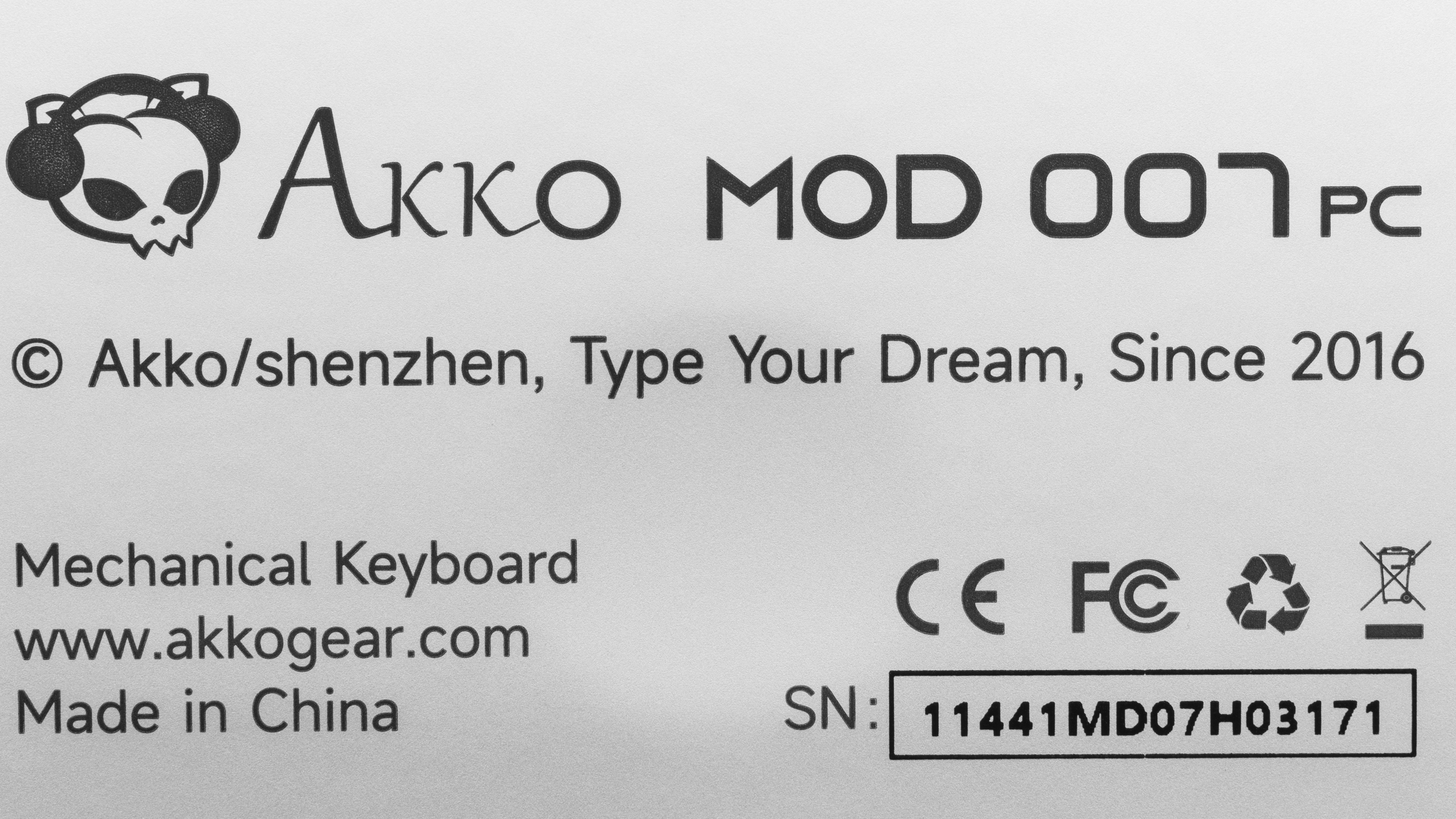 The Akko MOD007-HE PC is part of Akko's wider MOD007 lineup. The extended lineup can be confusing as it has both barebones and prebuilt models. They also may use mechanical or magnetic switches, have aluminum cases, and occasionally use different software. However, this review is only representative of the pre-built MOD007-HE PC models which use Hall effect switches and have polycarbonate plastic cases in different color/keycap themes. We bought the Akko MOD007-HE PC in the Stellar Journey theme. See the label for our unit.