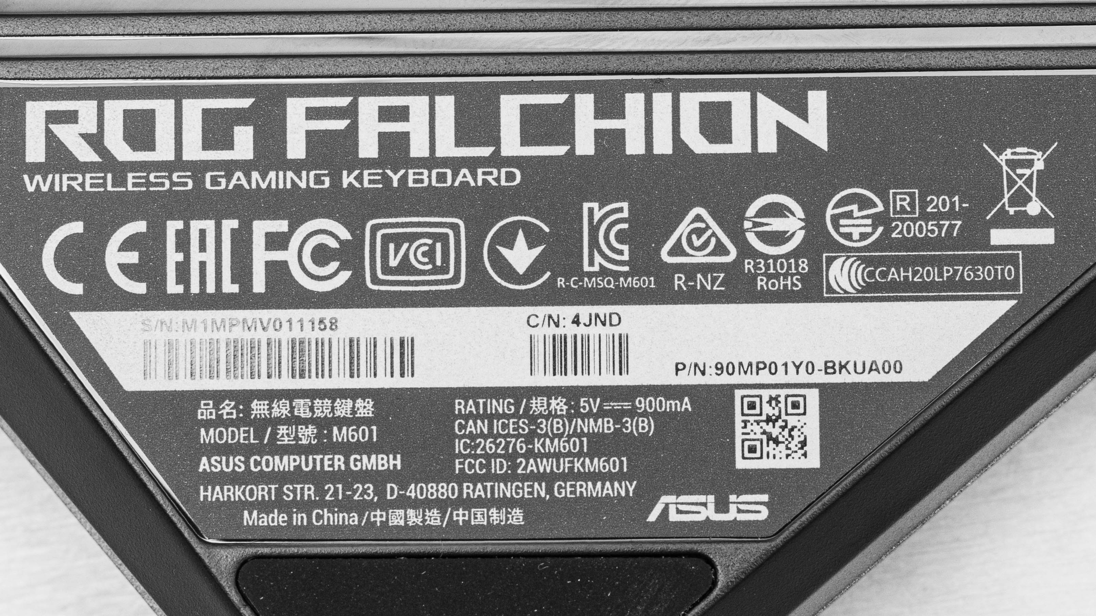 We tested the ASUS Falchion with Cherry MX Red switches, but it's also available with Cherry MX Brown, Blue, and Speed Silver switches. You can see the label of our unit here.