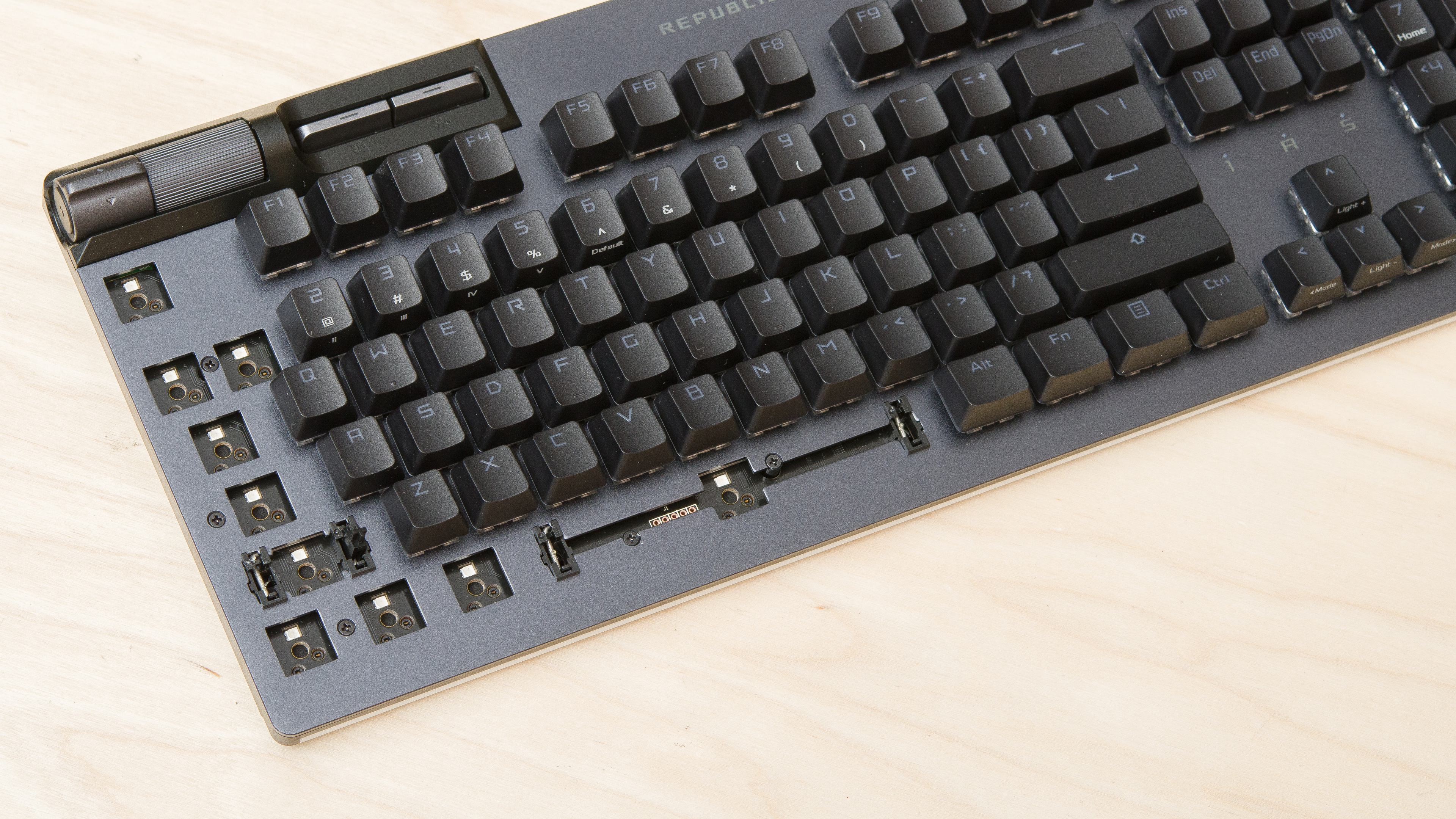 The ROG NX Brown switches have a light actuation force and a fairly short pre-travel distance. The tactile bump comes early in the keypress, so the tactility is quite noticeable. However, you can get this keyboard with your choice of ROG NX tactile Brown, clicky Blue, or linear Red. Or, you can get this board with Cherry MX switches in the same offerings. If none of those choices suit you, you can make use of the keyboard's hot-swappable PCB that has a 3-pin socket compatible with most switches.