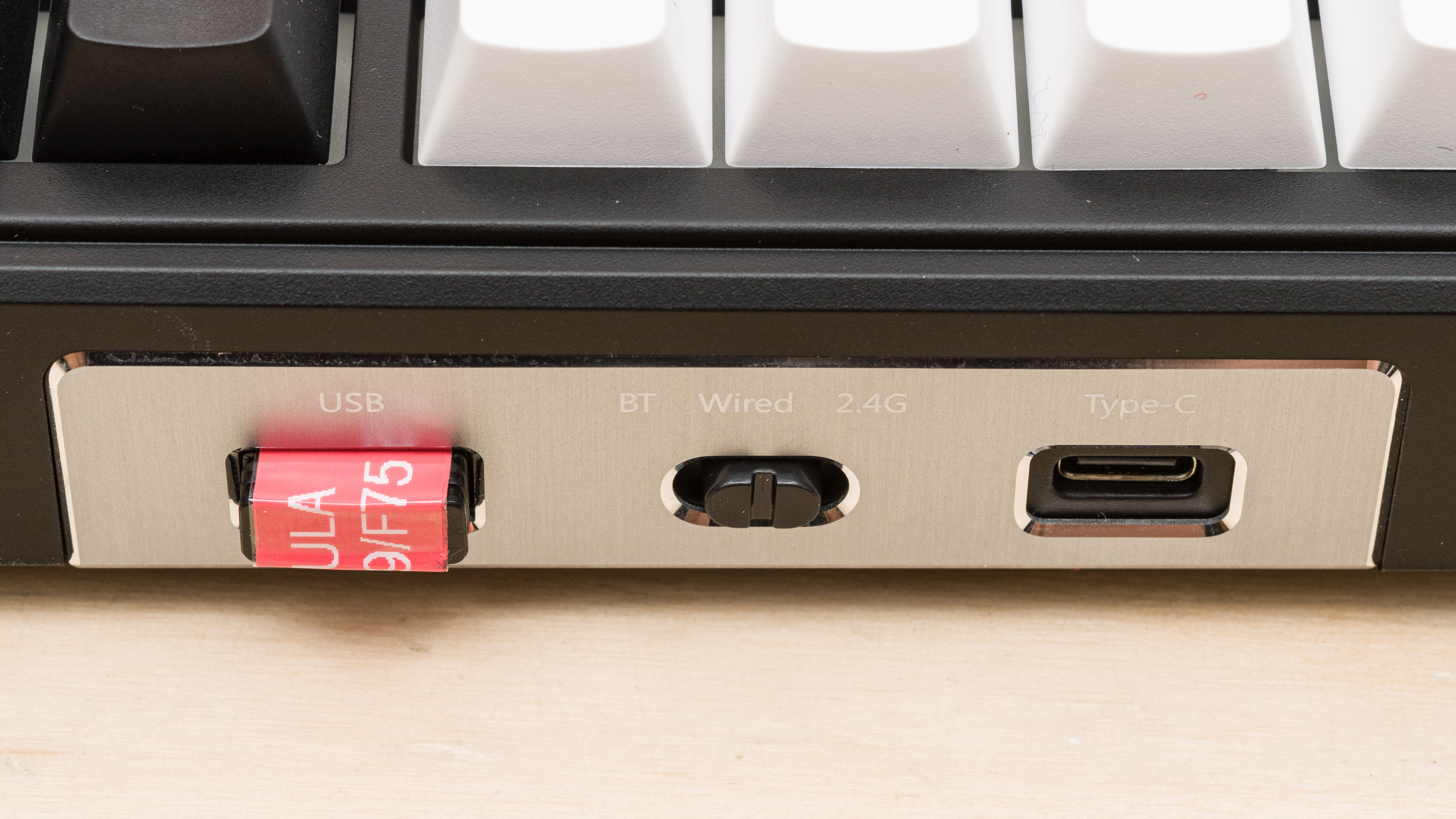 These keyboards are variously advertised with polycarbonate or FR4 plates. We didn't open our keyboard, but from the sound profile, we expect our model to use a polycarbonate plate, which is a bit more flexible than FR-4.