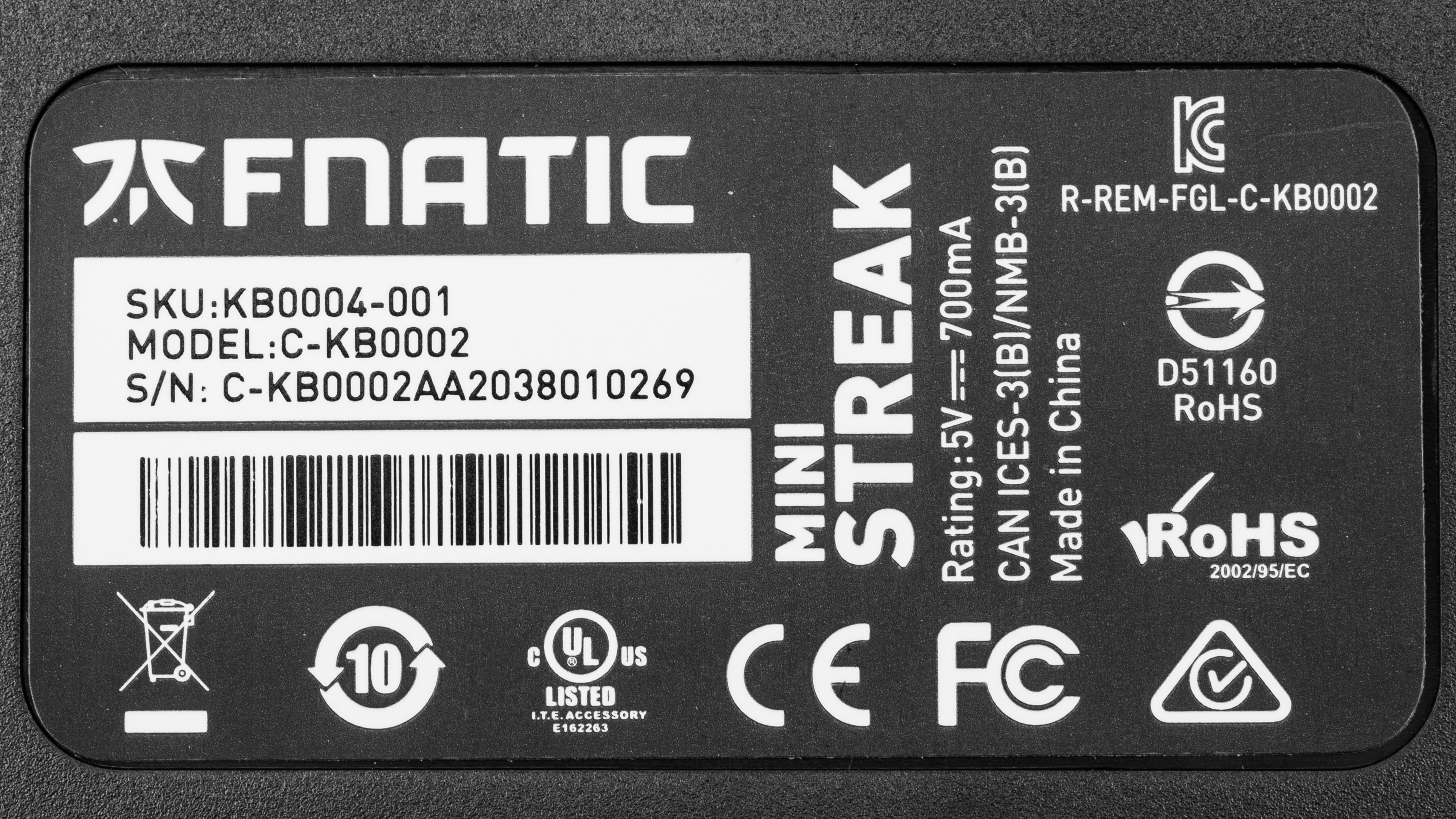We tested the Fnatic miniSTREAK Pro with Cherry MX Silent Red switches, but it's also available with Kailh Speed Silver switches. It's an upgraded variant of the discontinued model by the same name, which came with a wrist rest, a different keycap font, and was available in Cherry MX Red, Blue, or Brown switches. You can see the label of our unit here.