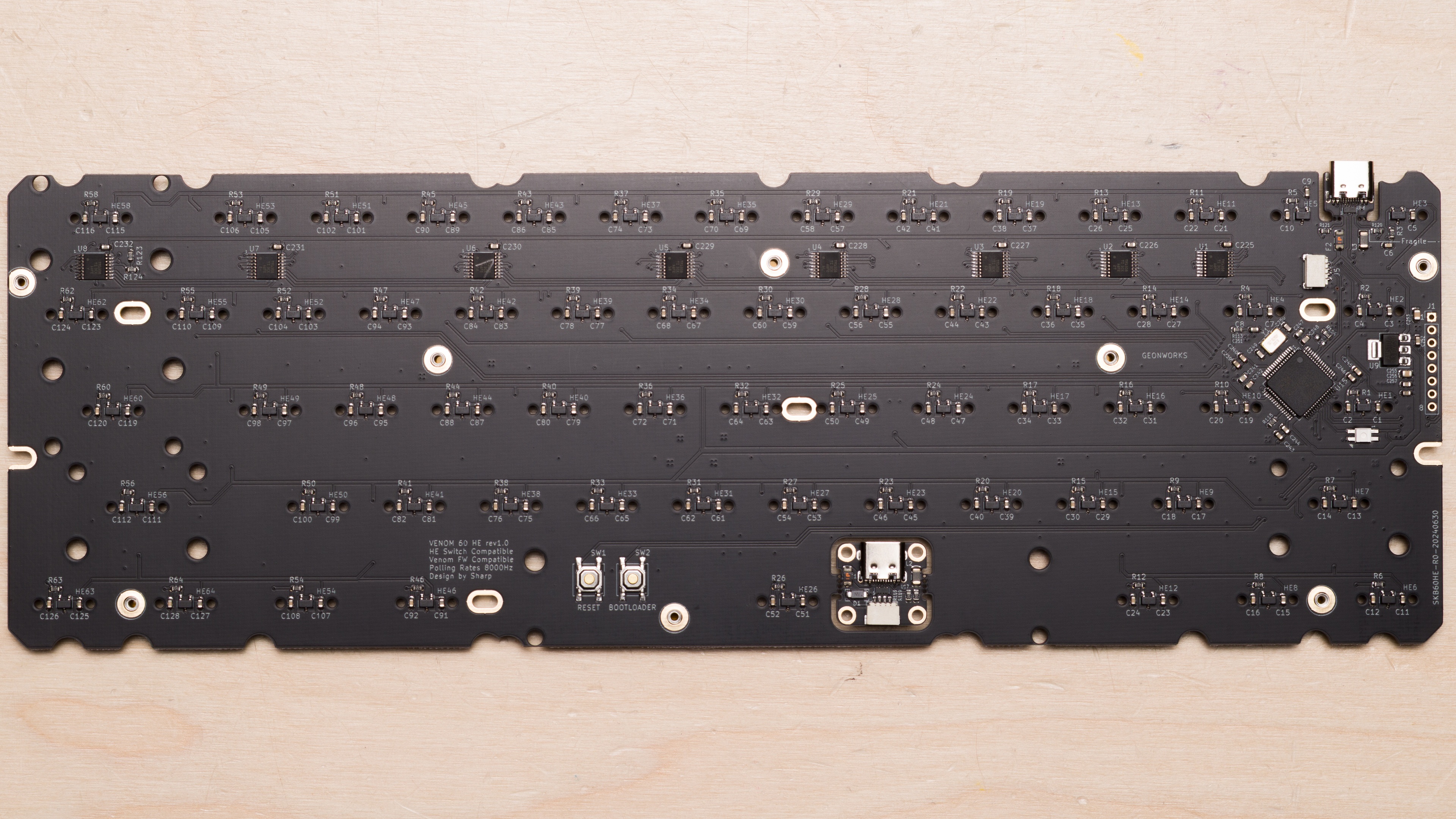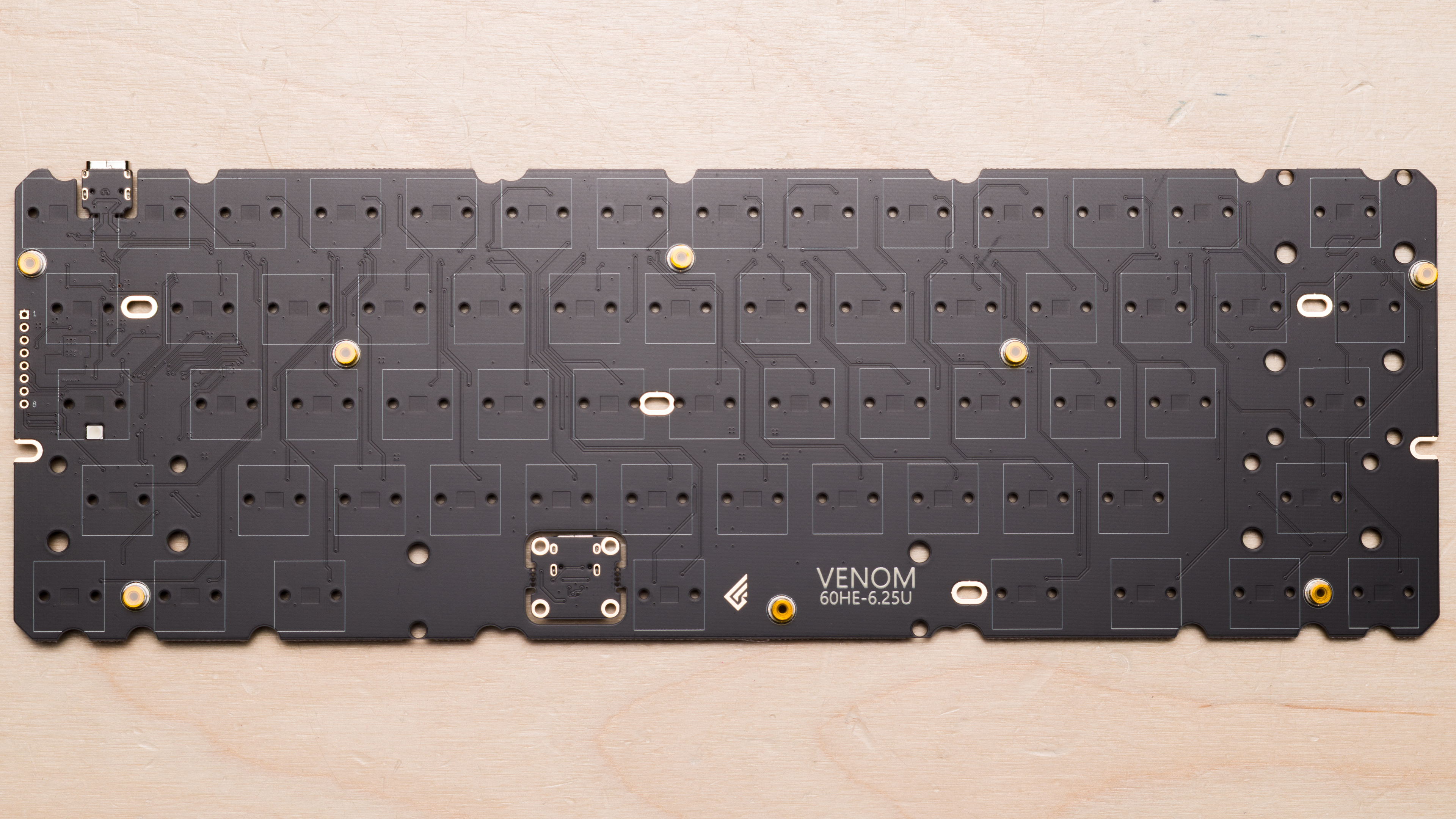 Rather than a full pre-built keyboard, the Geonworks Venom 60 HE is a custom keyboard PCB that uses Hall effect switches. You need to buy several other components and build the keyboard yourself to use it. In addition to the PCB, Geonworks sells compatible plates and switches on their website, including the GEON Raw HE switches we tested. For more information on configuration options, see the Differences Between Variants section. This keyboard also uses web-based firmware that allows you to program custom profiles, adjust actuation distance, and configure more advanced features like Rapid Trigger, SOCD, and 'focus' priority scanning.