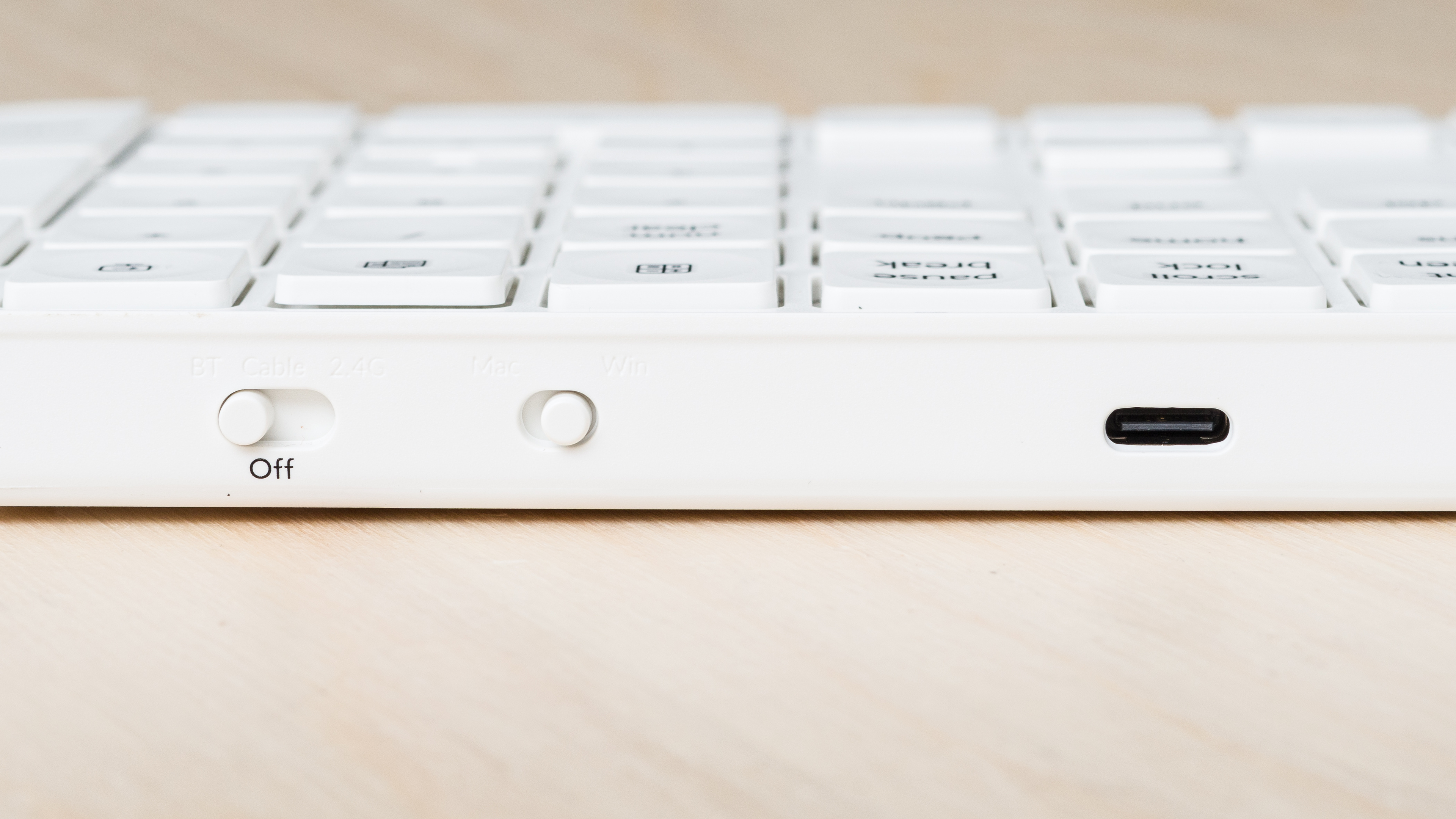 There are two switches on the top edge: one of which toggles between connectivity modes while the other toggles OS compatibility modes. Note that these switches are labeled, but the writing is white and very faint, so it's hard to see in the photo. There are also several LED indicators in the top right corner (pictured above) for Caps Lock, Num Lock, connectivity, and battery status.