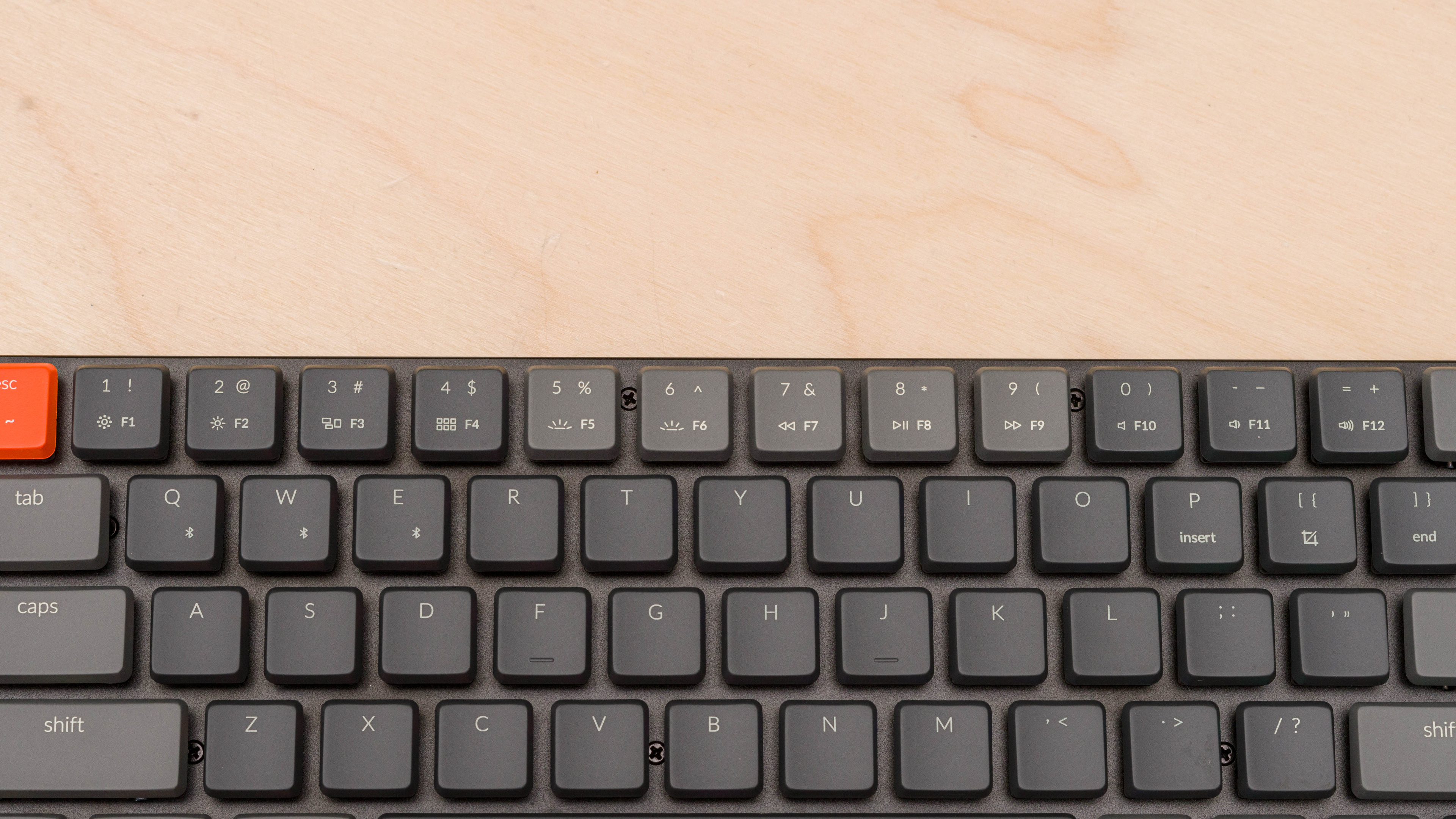 The Keychron K7's typing quality is good. The ABS keycaps have a soft feel to them, though they might eventually get shiny from finger oils, and the keys feel mostly stable with only a bit of wobble. The Gateron Low Profile Switches on our unit feel light to type on and provide nice tactile feedback, but some people may not like the shorter pre-travel distance of the low-profile switches. While it doesn't come with a wrist rest, the board is low enough that you shouldn't feel wrist fatigue without one. Your typing experience will vary if you have different switches installed.