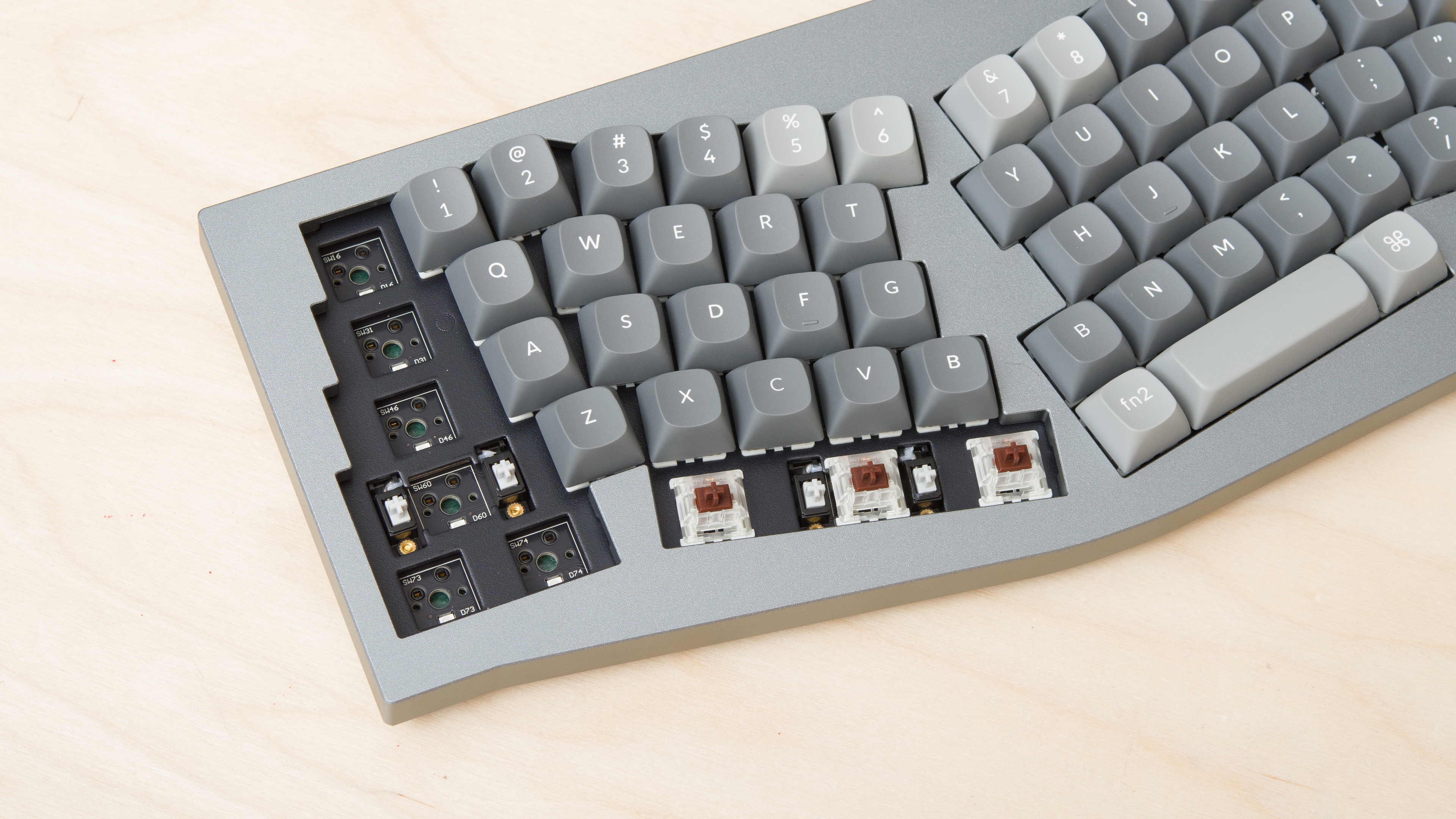 The pre-assembled version of the Keychron Q8 is available with your choice of Gateron G Pro linear Red, clicky Blue, and tactile Brown switches installed. Since the circuit board is hot-swappable, you can change these stock switches out easily with most other 3-pin or 5-pin switches without soldering. Gateron G Pro brown switches come pre-lubed from the factory, resulting in a smooth keypress the whole way down. They don't require much force to actuate, and the tactile bump doesn't feel too resistant or heavy to get over. These switches also have a long pre-travel distance, which is great for avoiding typos, but they don't feel as responsive for gaming.