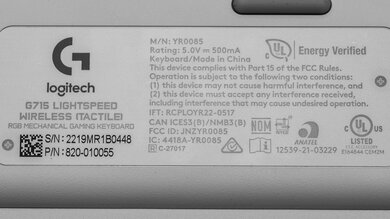 The Logitech G715 has a great build quality. Its plastic chassis is very solid and exhibits minimal flex, and the metal top plate has no flex. The keycaps are made of double-shot PBT plastic, and the legends are shine-through to allow the RGB lighting to be visible. Underneath the board, the six rubber feet do a good job of keeping the board in place, and there's a storage compartment for its USB receiver. Unfortunately, some of the modifier keys lack stabilizers altogether and wobble very noticeable during use.