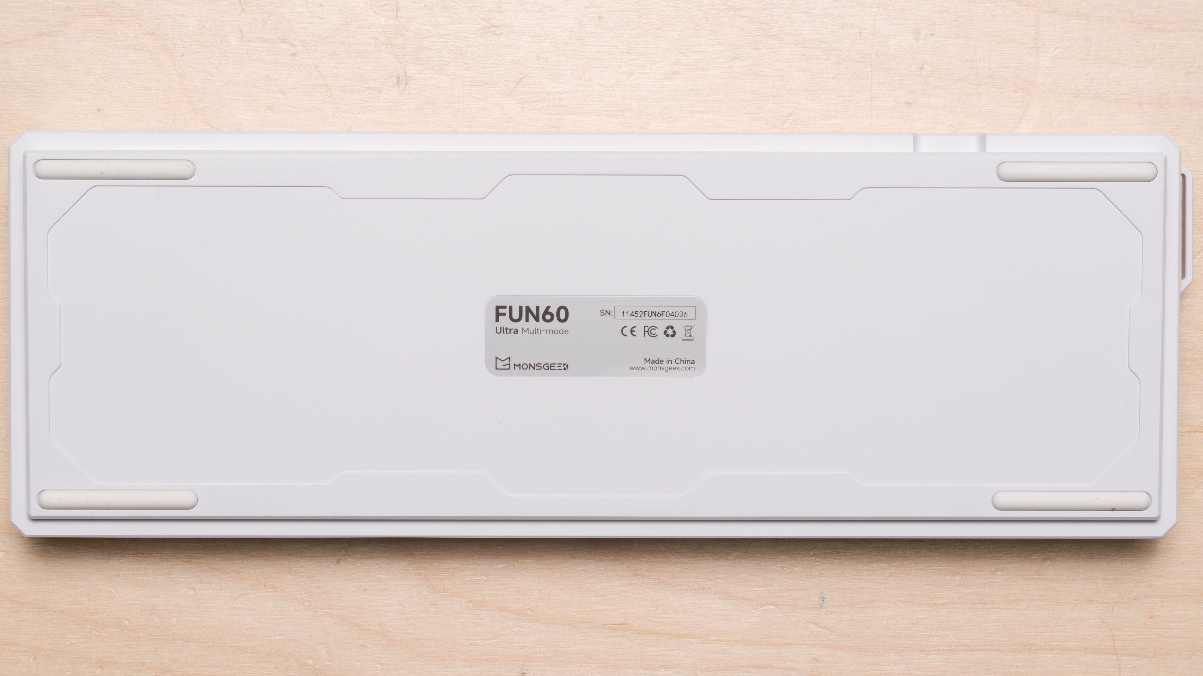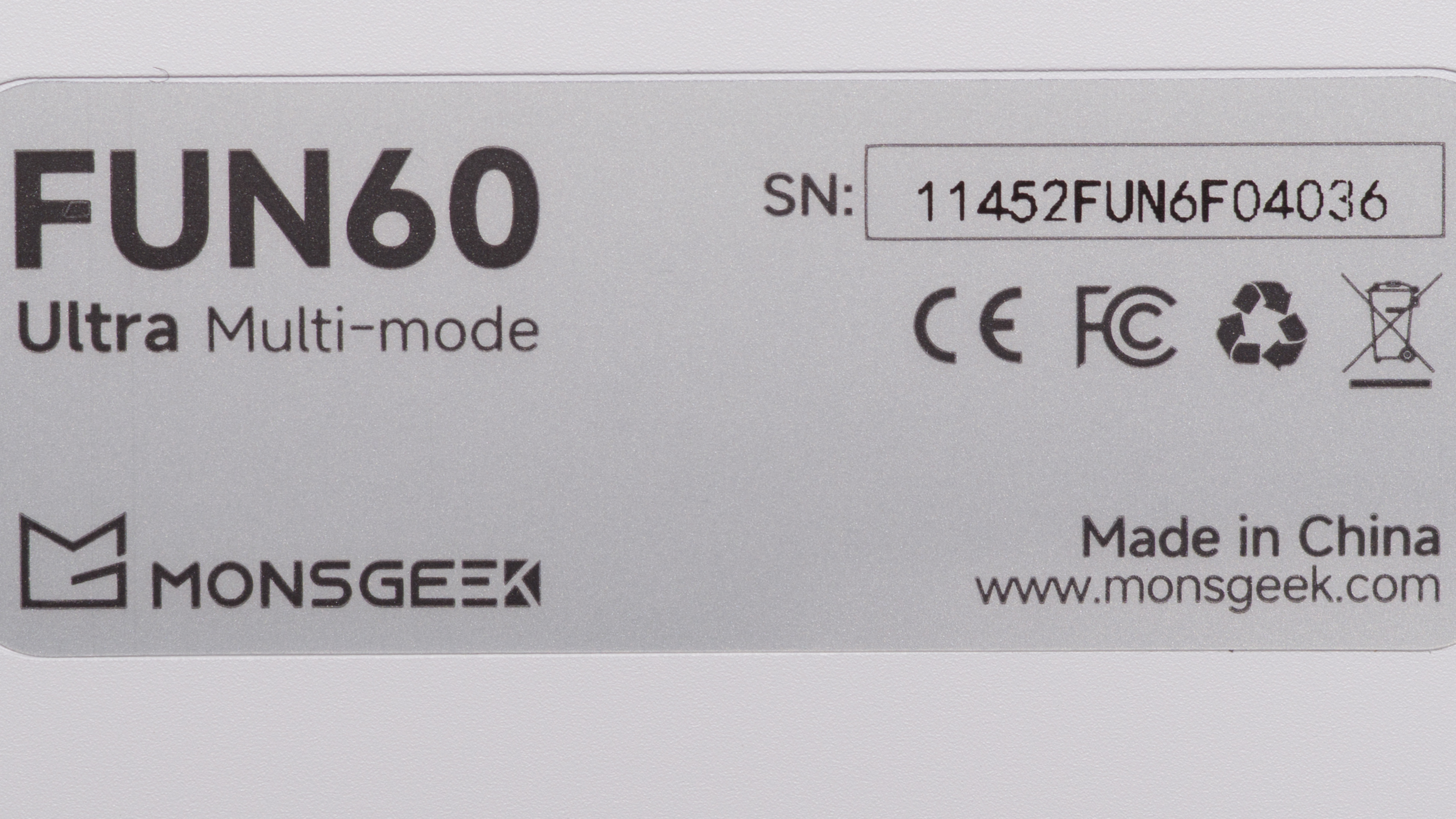 The MonsGeek FUN60 Ultra is a gaming keyboard with magnetic switches. It's available in several colorways with different keycap sets, and a wired or wireless configuration with either Hall effect or TMR PCB. We bought and tested a Shine-through PBT (White) colorway model in a wireless configuration with TMR sensors. See our unit's label.