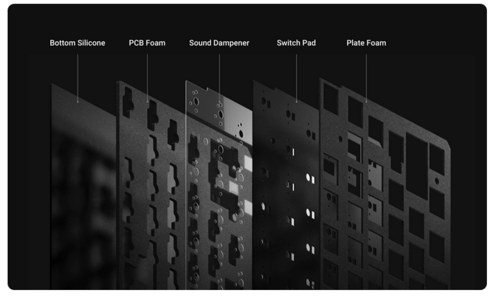 Several layers of acoustic and dampening material inside the case (image of the foam layers from NuPhy's website) help round out the sound profile. You can swap out or remove these layers to further customize your typing experience.