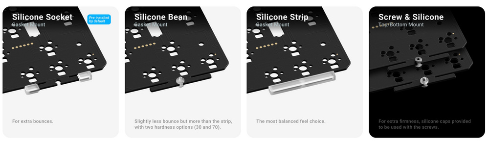 By default, this keyboard comes with silicone sockets installed that give a slightly springy quality to typing.