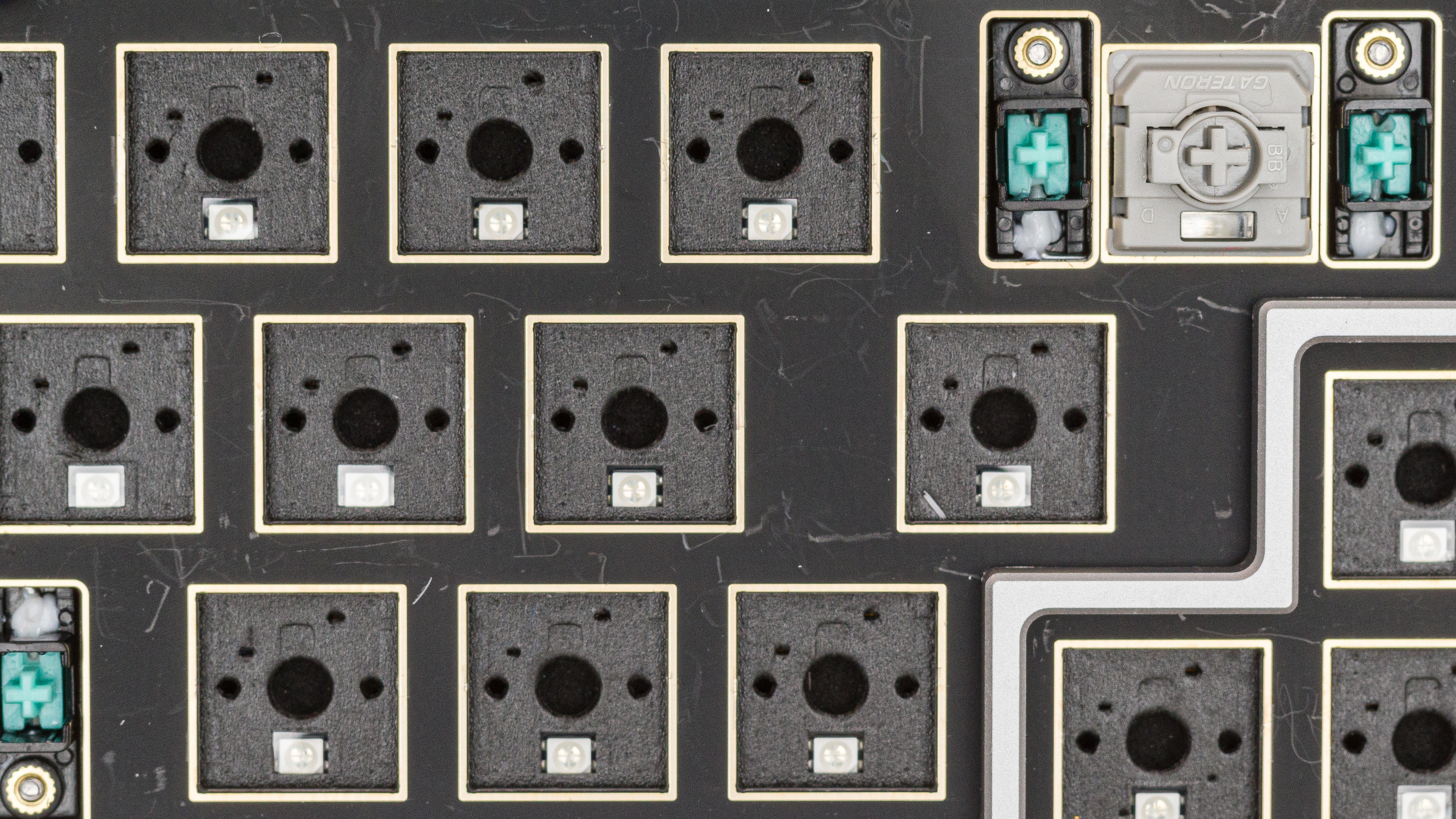 The LEDs are South-facing, which generally provides good visibility of the lighting effects when you're seated at your keyboard. However, this also limits the amount of light that will pass through most shine-through keycap sets, which are typically designed for North-facing LEDs. Additionally, this keyboard has 1u-sized right mod keys, which are slightly less common than the typical 1.25u size.