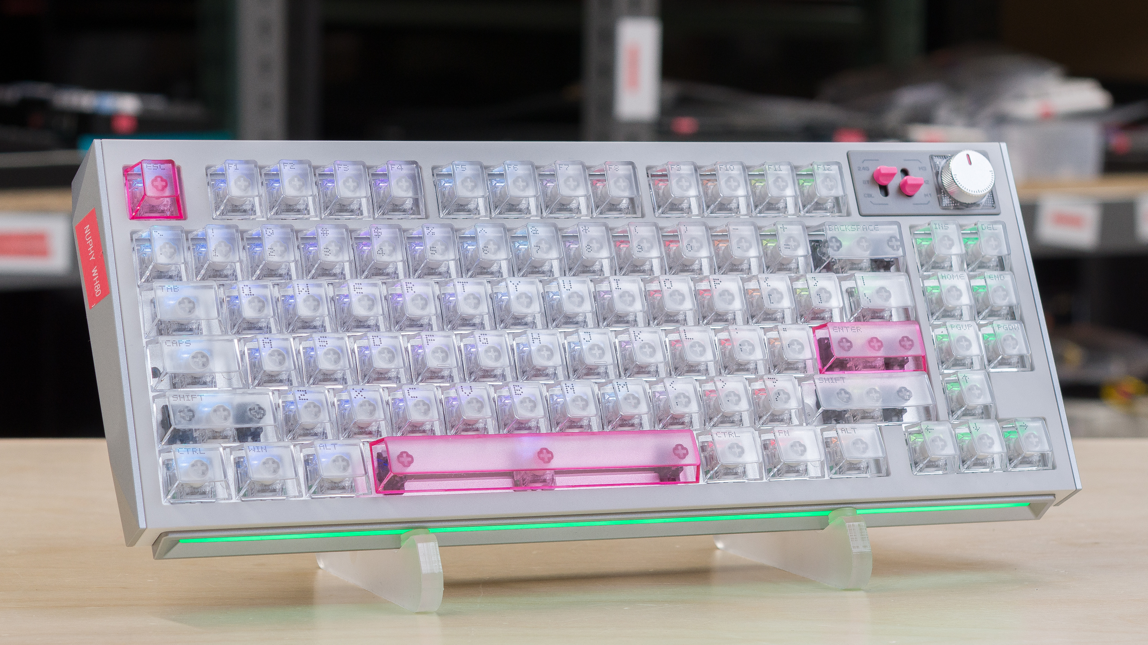 The NuPhy WH80 gaming keyboard is available in Nova Black or Nova White. We bought our unit in the Nova White colorway that comes bundled with an extra set of clear keycaps with pink accents. Here's our keyboard's label and a picture of the keyboard with the clear keycaps installed.