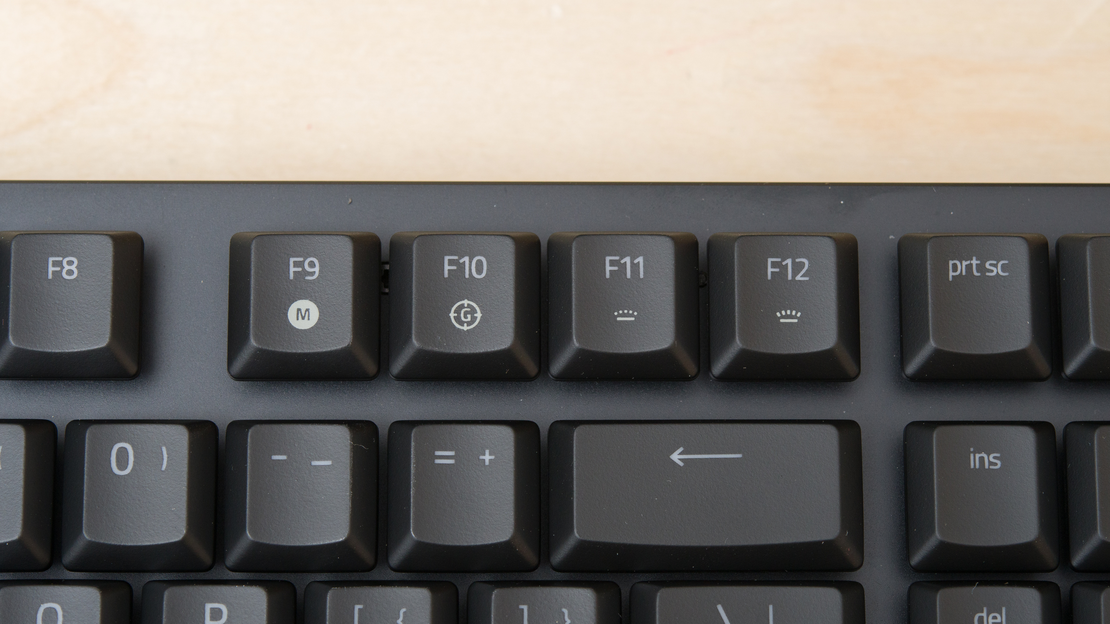 This keyboard has various hotkeys and a set of dedicated media controls, including a volume roller and a multi-function button with Play/Pause and Next Track/Previous Track functions depending on the number of times you tap it. Note that you cannot reprogram this multi-function button using the customization software. There are additionalcontrols on the back edge of the chassis to switch between connection types and paired devices. If you're interested in a similar gaming keyboard with additional dedicated macro keys on the left side of the board, check out the Razer BlackWidow V4 Pro.