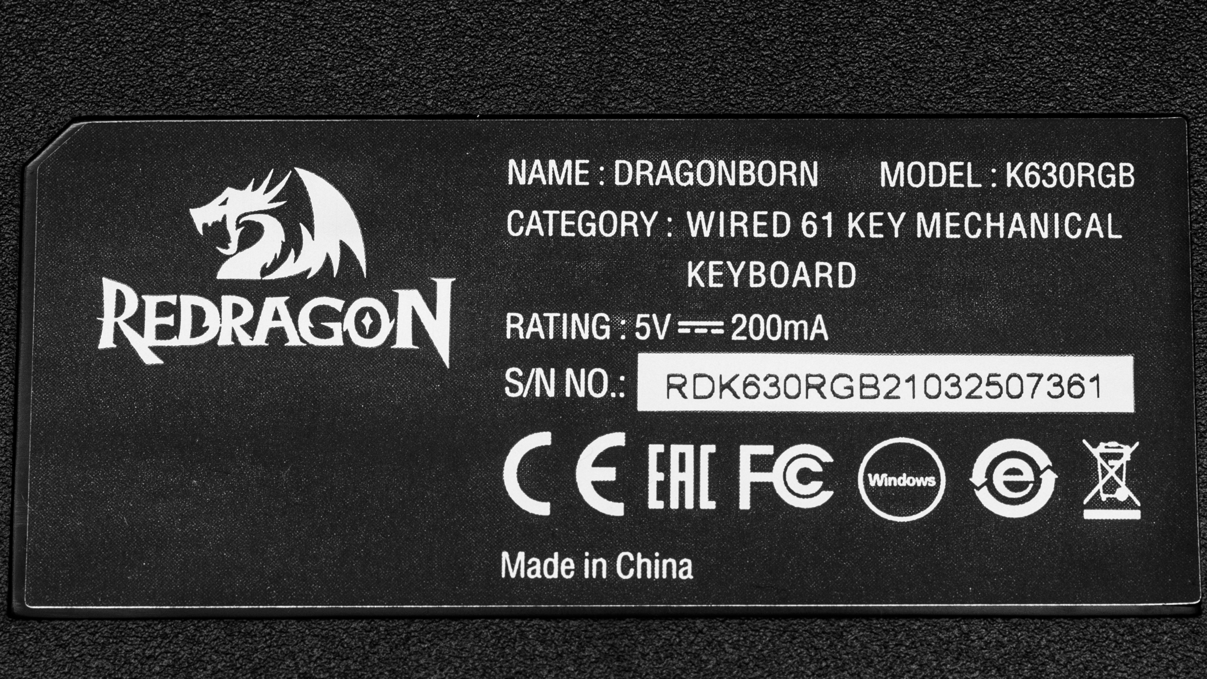 We tested the Redragon K630 Dragonborn in black with Redragon Brown switches, but it's also available with linear Redragon Red or clicky Blue switches. The board is also available in white. There's also a variant with the same name that has pink backlighting instead of RGB. While not a variant, the Redragon Draconic K530 looks nearly identical to the K630, but it's wireless. You can see our unit's label here.
