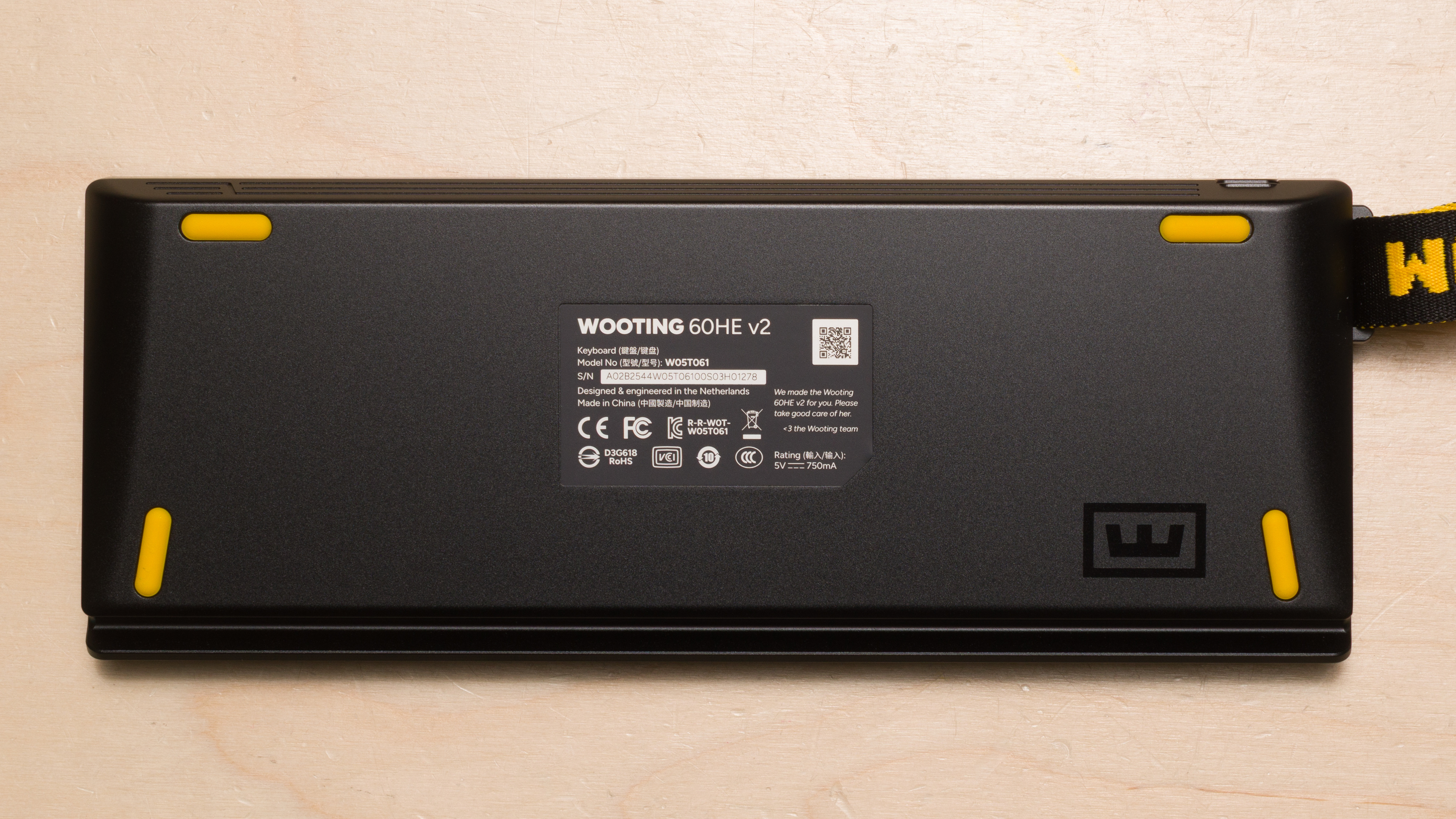 This keyboard has a moderately tall, standard-profile design with the same home row height as the original Wooting 60HE. Unlike the Wooting 80HE, it doesn't include silicone feet for adjustable incline levels.