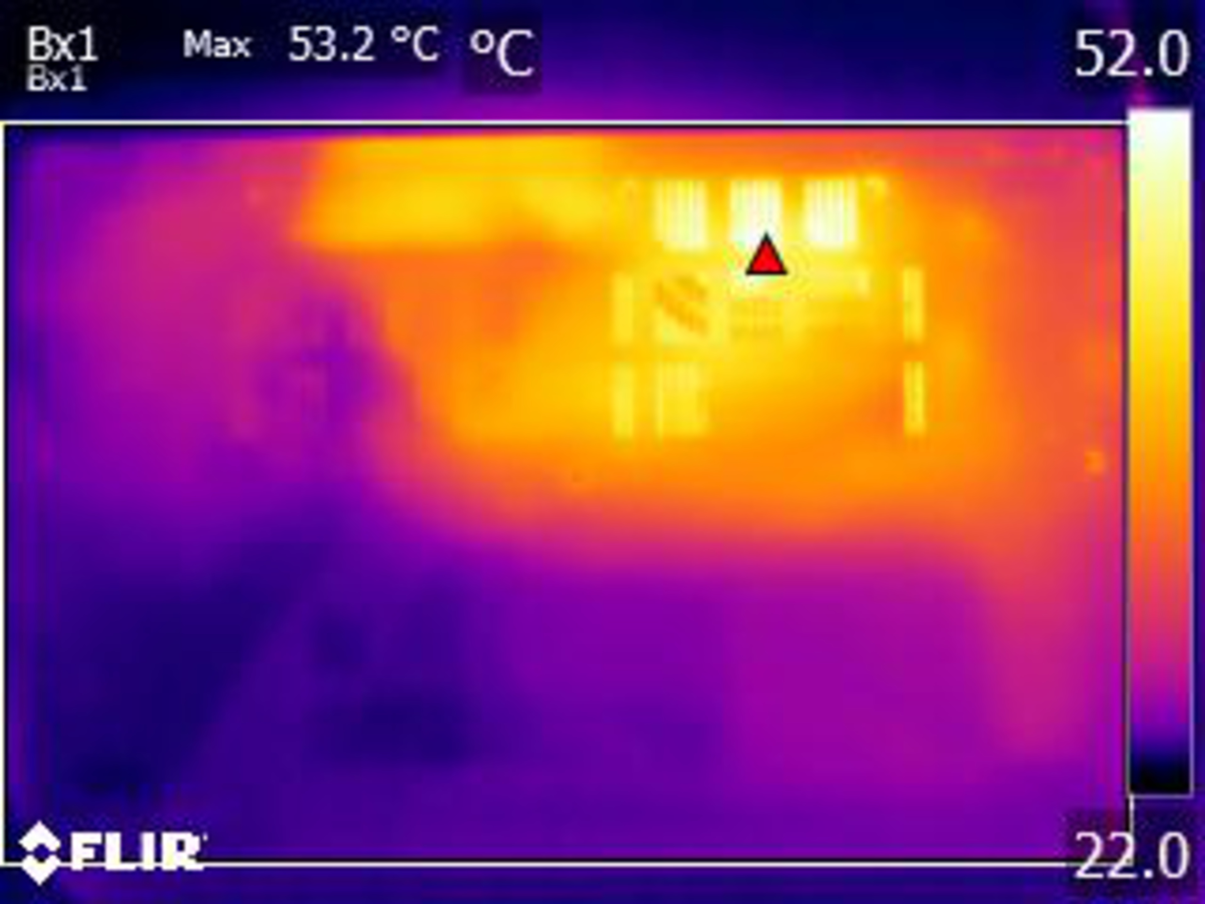 The keyboard gets a little toasty under load and can cause some discomfort, as the hot spot is near the number 4 key. Unfortunately, the bottom gets even hotter, reaching 53.2 °C (127.76 °F), so you'll have to be careful when using the device on your lap. The fan gets pretty loud, sometimes producing a light, high-pitched whistling noise.