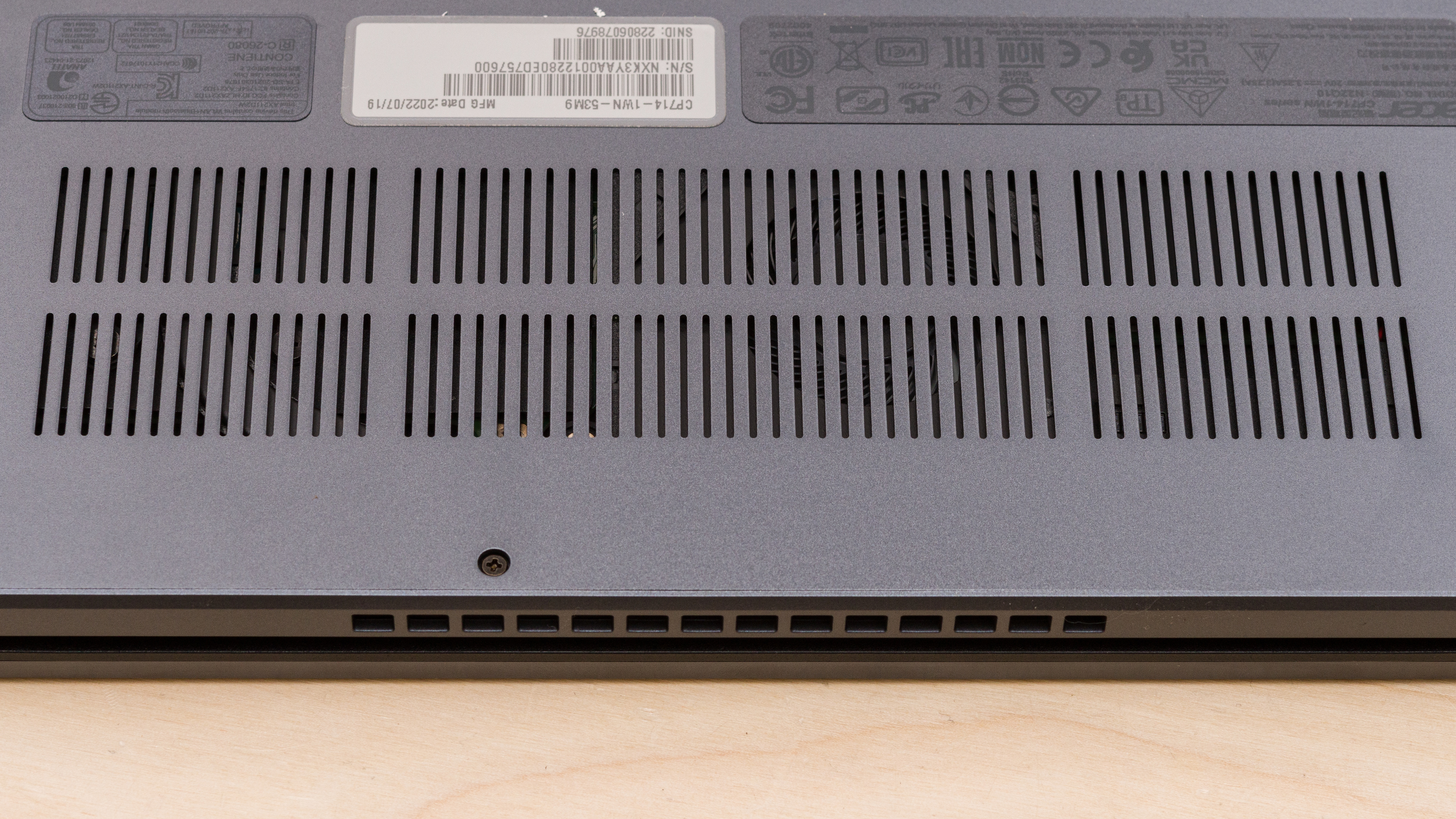 The Acer Chromebook Spin 714's serviceability is sub-par, as only the SSD and battery are user-replaceable. It's easy to access the internals, though. You only need to remove nine Philips screws and pry open the bottom panel with a pick or prying tool. The only thing to look out for is the stylus, as there's nothing holding it in place aside from the bottom panel, so it can slide out easily.