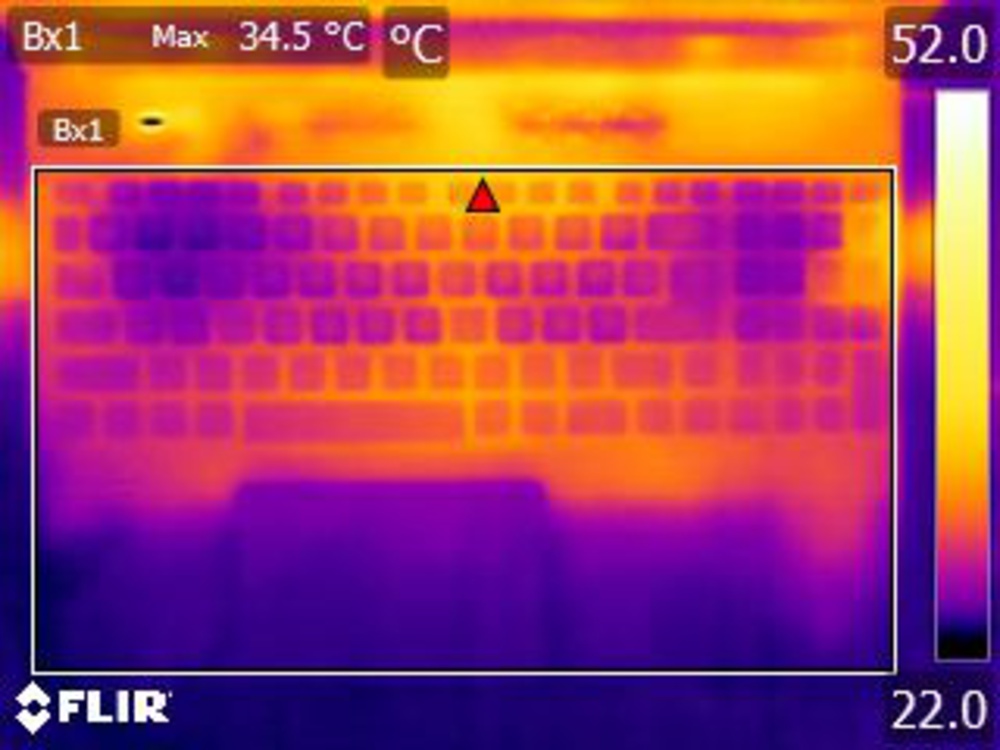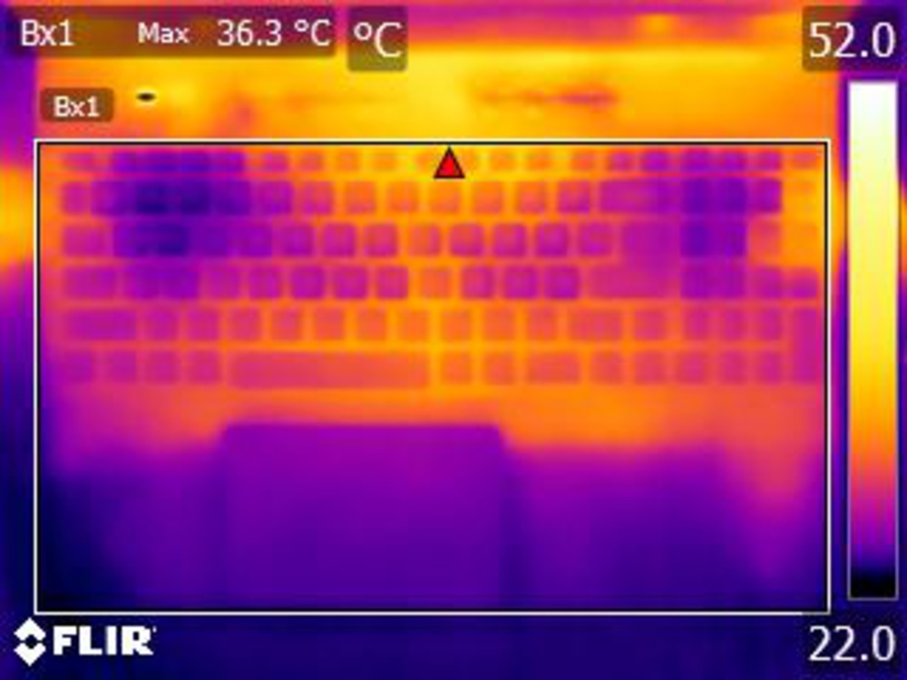 When using every fan mode except Max, this laptop is silent when idle. The noise picks up a lot under load; it reaches 45 dBA when using the Balanced or Performance mode, while the Turbo mode without the Max fan setting increases the noise even higher to 49 dBA, just under the 49.5 dBA when using the Max fan setting. The laptop remains cool under load. Using the Balanced performance mode, the hotspot is just 34.5 °C (94.1 °F), while Performance mode without Max fans results in a hotspot of 36.3 °C (97.3 °F).