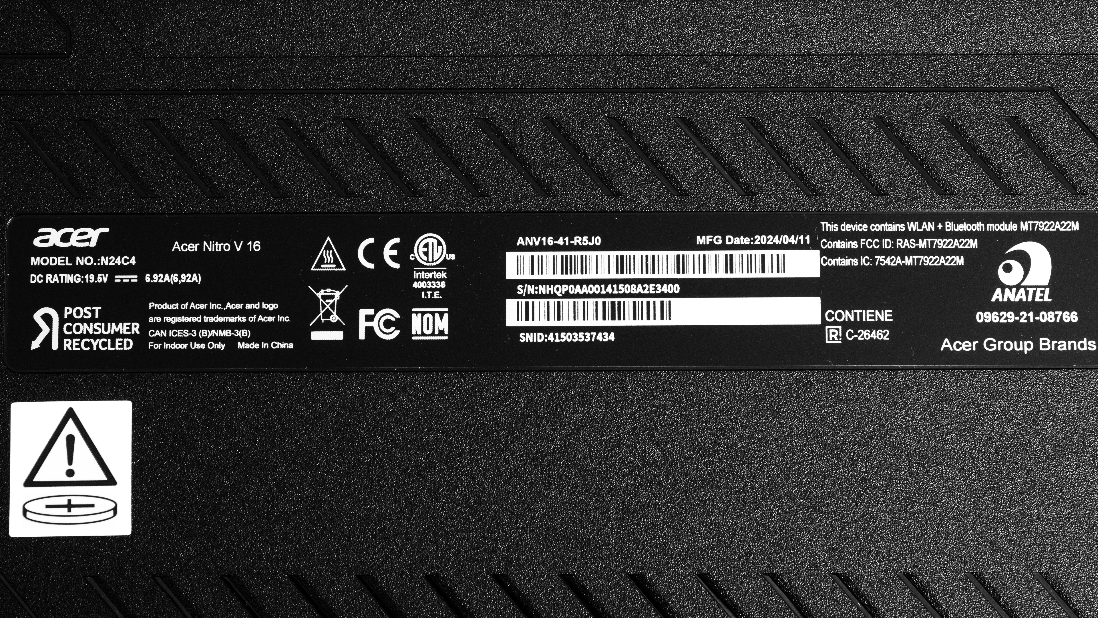 We tested the Acer Nitro V 16 (2024) (model number ANV16-41-R5J0) with an FHD+ 165Hz display, Ryzen 7 8845HS CPU, NVIDIA GeForce RTX 4060 GPU, 16GB of RAM, and 1TB of storage. The display, CPU, GPU, RAM, storage, and color are user-configurable; see below for all configuration options: