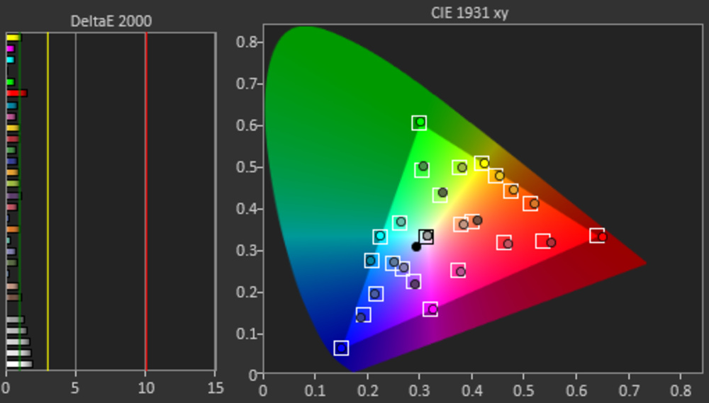 The display defaults to its DCI-P3 mode. Using the sRGB mode yields similarly impressive results: