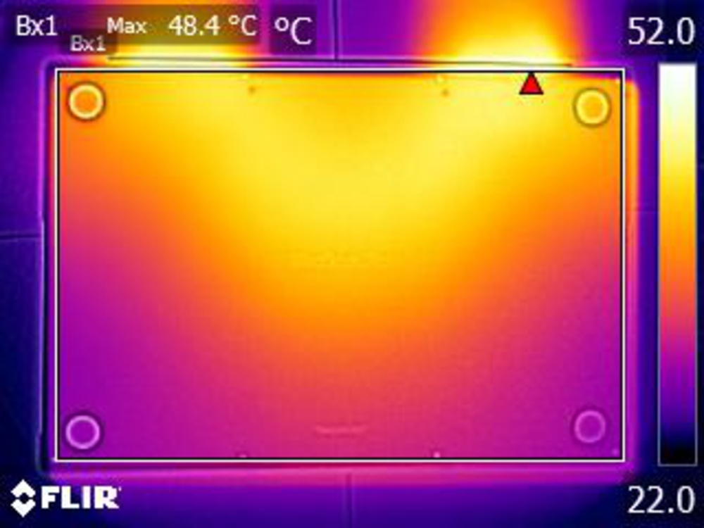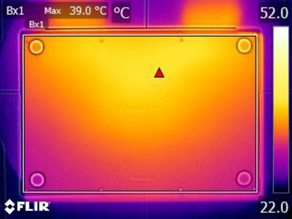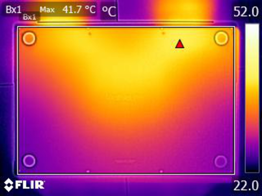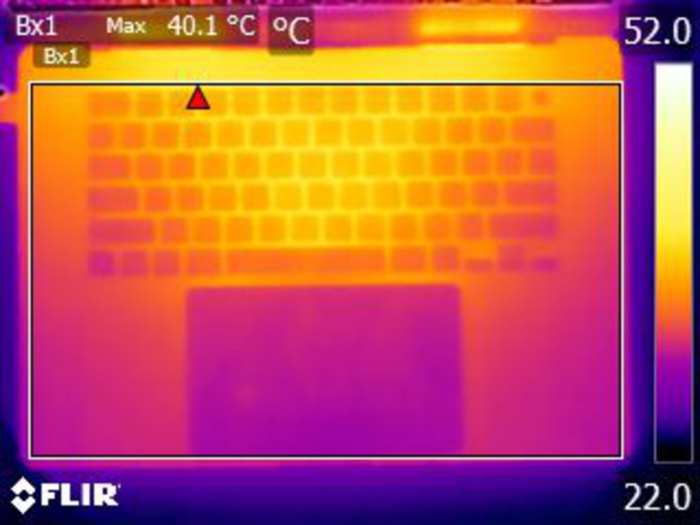 Using the default Automatic mode results in a slightly lower 49.6 dBA of fan noise under load. Temperatures improve to a more comfortable 45.2°C (113.4 °F) on the keyboard and 41.7°C (107.1 °F) on the bottom of the laptop. Low power mode sees just 27.2 dBa of fan noise, a cool 40.1°C (104.1 °F) on the keyboard, and 39°C (102.2 °F) on the bottom of the laptop.