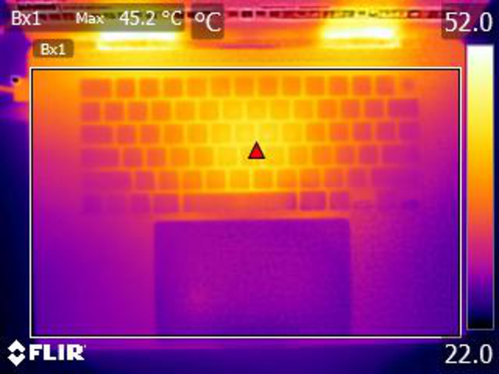 The keyboard can be uncomfortably hot under load as the hotspot is directly in the middle of the key deck. The bottom of the laptop reaches 48.4°C (119 °F) under load, which is hot enough that you'll want to avoid keeping it on your lap. The fans ramp up under load and are quite loud, but the noise isn't overly annoying. The posted results use the Apple MacBook Pro M4 Max's High Power mode.