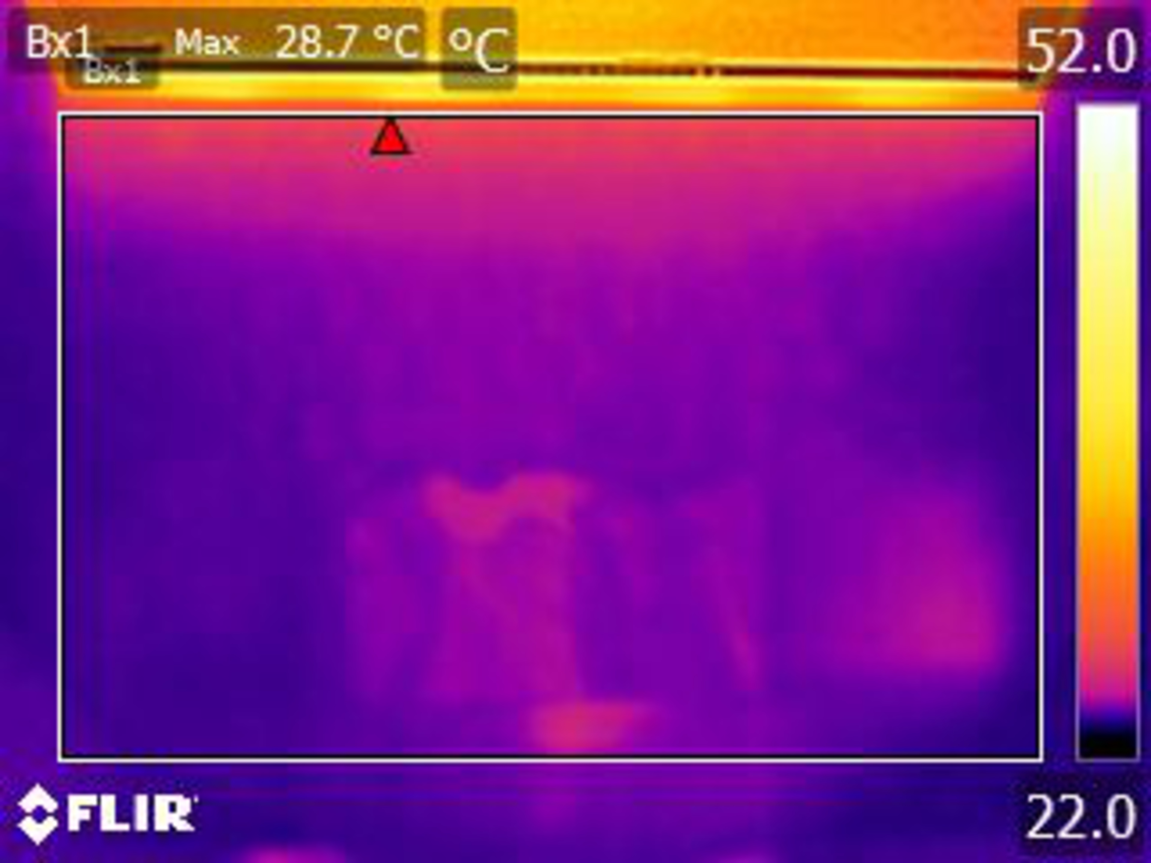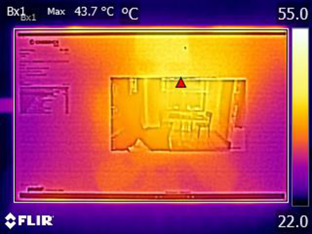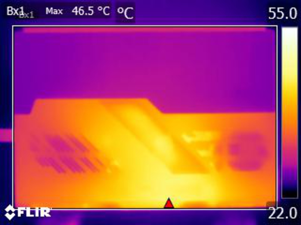 This is a tablet PC with all of its components behind the display, so the heat doesn't affect the keyboard at all. The tablet itself gets only mildly warm, reaching 43.7 °C (110.66 °F) under load. The back of the device gets a little hotter at 46.5 °C (115.7 °F). If you find the back too hot, you can flip the keyboard around and use it as a protective layer.