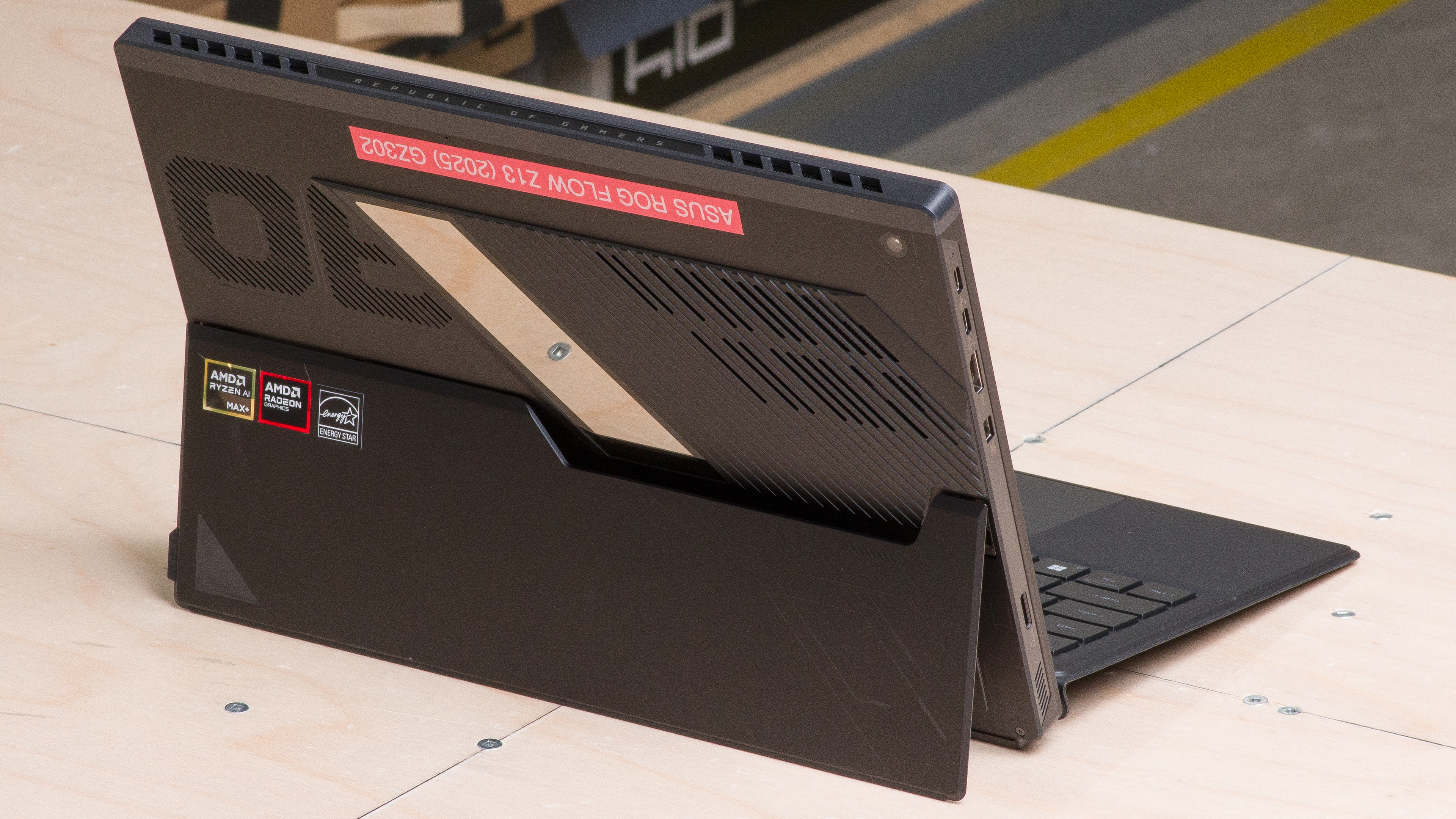 The ASUS ROG Flow Z13's build quality is outstanding. Its aluminum chassis feels very sturdy, with no obvious gaps in the construction. The built-in kickstand feels equally solid. The finish doesn't scratch easily; however, it picks up a fair amount of fingerprints and smudges. As for the keyboard, it's entirely plastic and exhibits some flex, but it still feels pretty solid for a type cover. The keyboard attaches to the tablet magnetically; the magnets are pretty strong, requiring significant force to detach it from the tablet.