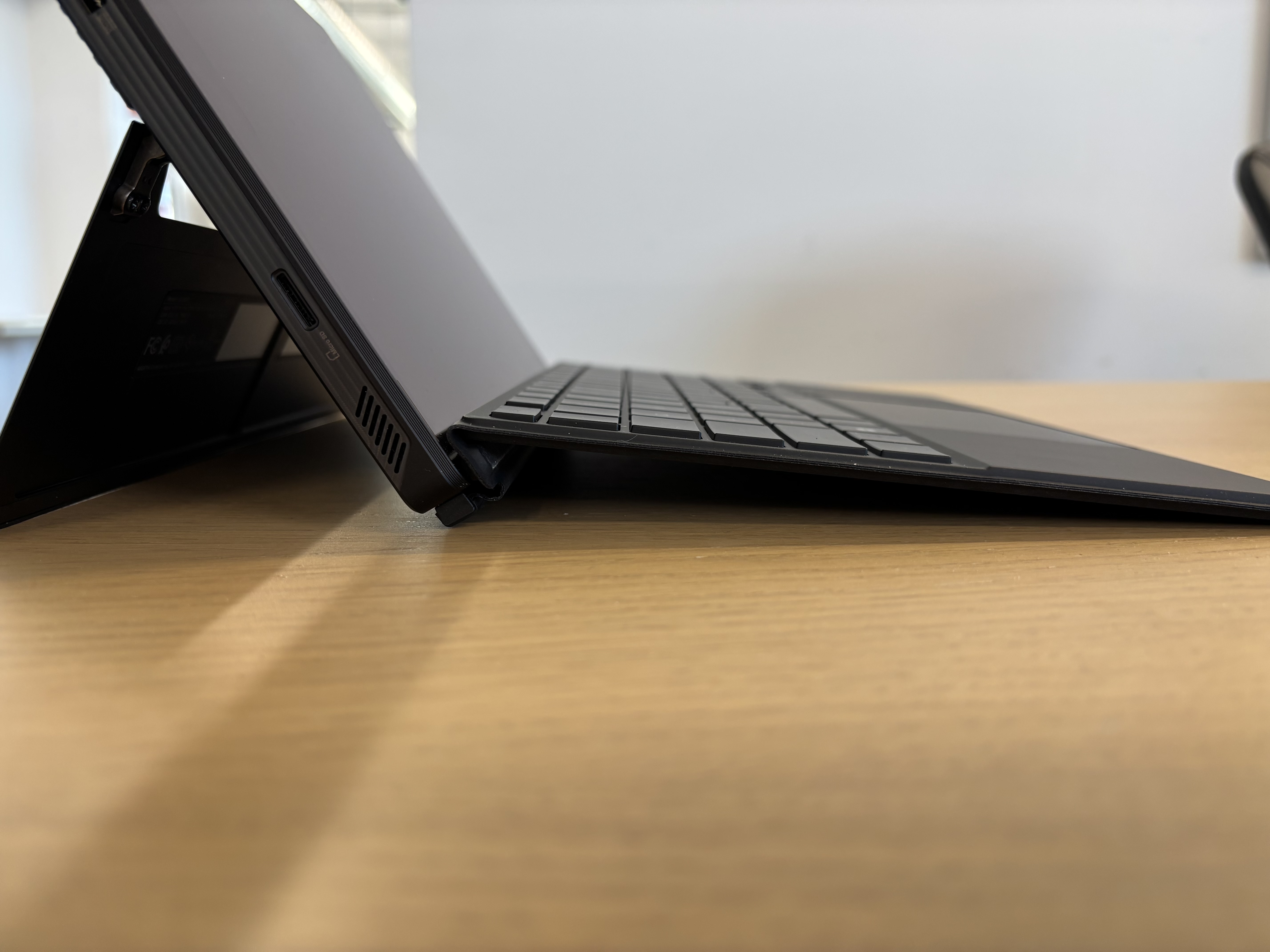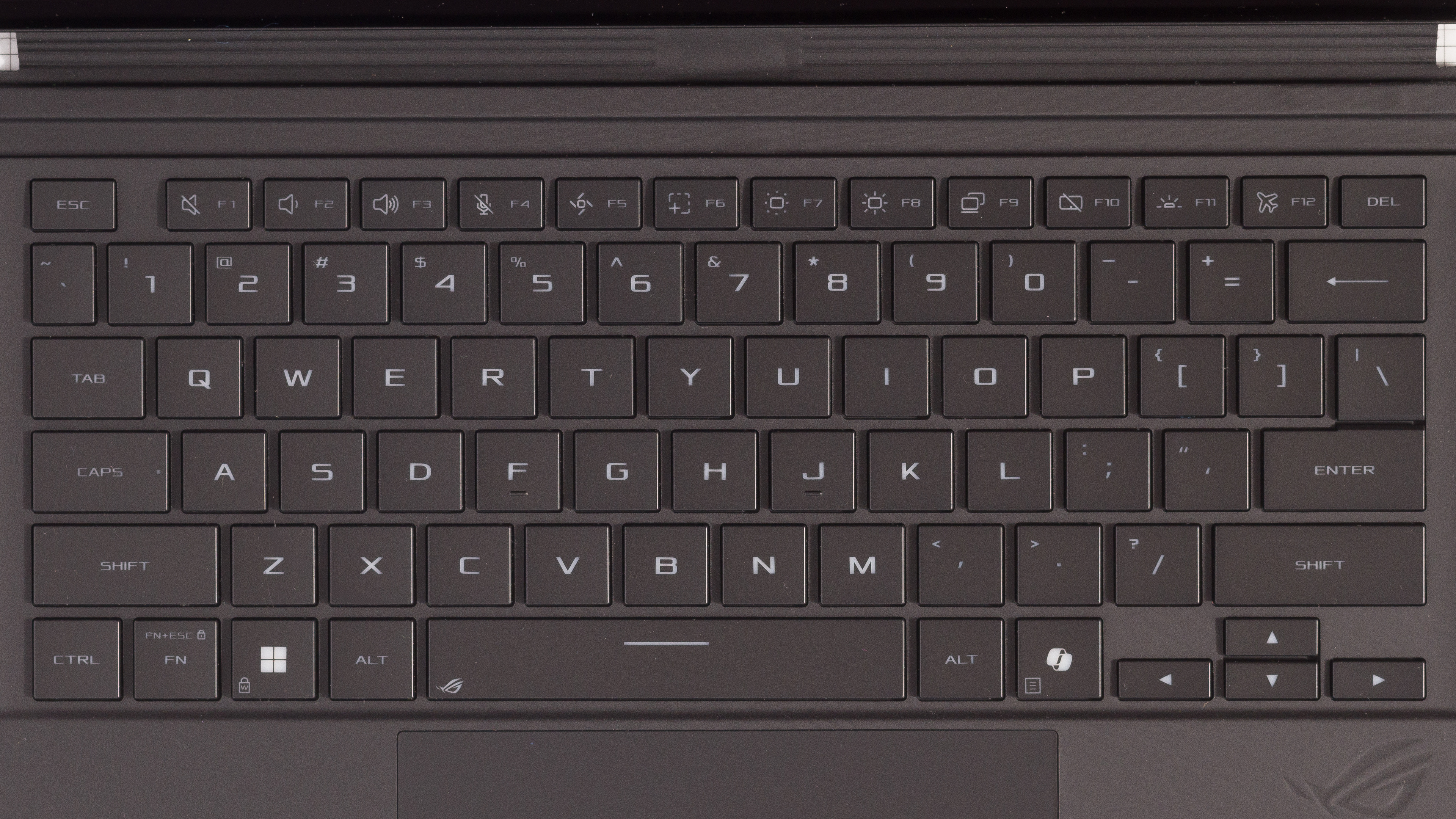 The ASUS ROG Flow Z13 has an okay keyboard. It's a detachable keyboard similar to that of the Microsoft Surface Pro 11th Edition (2024). It attaches to the tablet magnetically, and there are two positions: flat on the table or at a 10° incline. The keys are relatively stable, and while they could use a bit more travel, they do provide satisfying tactile feedback. That said, the typing experience changes drastically depending on whether you have it laid flat or at an incline, as the keyboard flexes significantly in the inclined position, making the typing experience somewhat mushy. Another downside is the form factor itself, as this type of detachable keyboard is rather unstable when using the device on your lap.