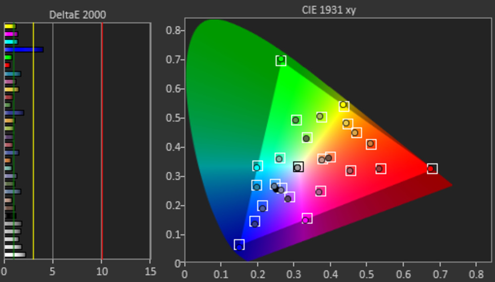 Since the default color profile is in the DCI P3 color space, we've also measured the display as a P3 display. Here are the results: