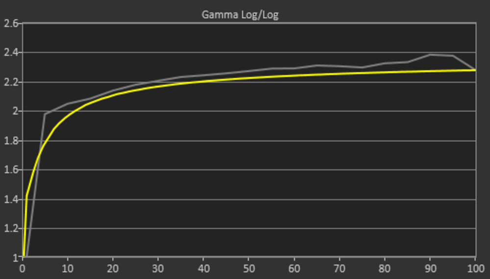 The QHD+ display's out-of-the-box accuracy is good. Most colors look oversaturated because the laptop targets a wide gamut, even in sRGB content, and the white balance is also off, especially at higher brightness levels. The color temperature is a bit cooler than the standard 6500k target, giving the image a slight, almost imperceptible, blueish tint. The gamma follows the sRGB curve almost perfectly; there's only some over-darkening in dark scenes. Note that these results are obtained with Vari-Bright disabled, a feature that automatically adjusts the screen brightness to extend battery life. This feature is on by default and only comes into effect when the laptop runs on battery; however, it seems to affect color accuracy, even when plugged in. With Vari-Bright enabled, the color and white balance dEs are slightly worse, the color temperature is warmer at 6305 K, and the gamma sticks almost to a flat 2.2.