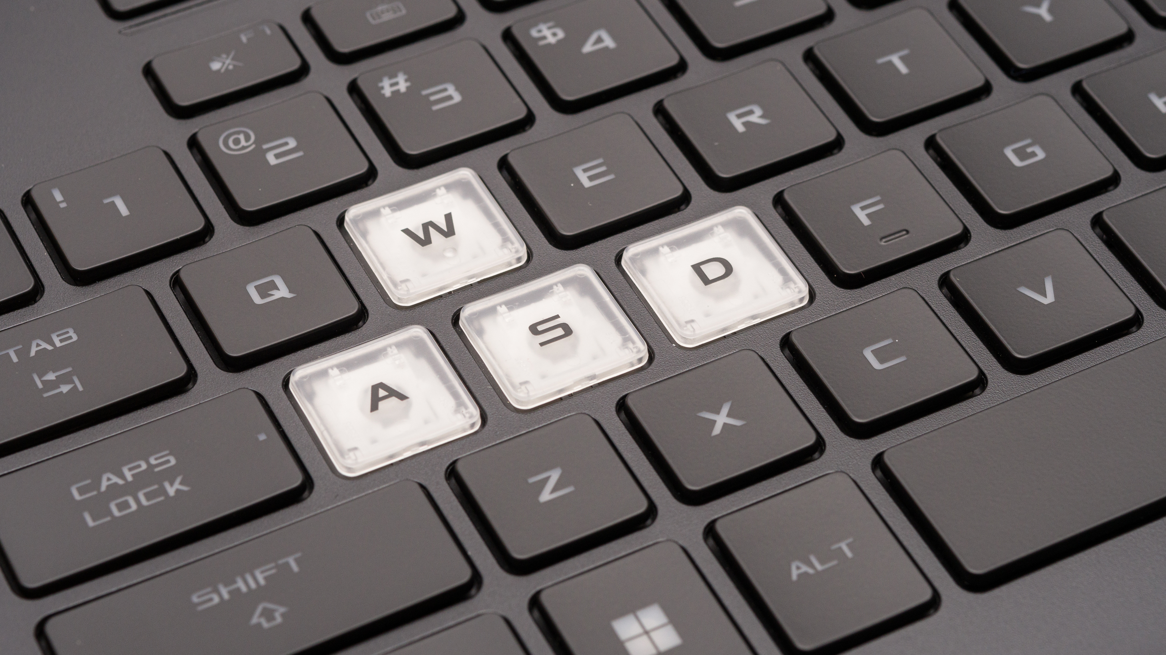 The ASUS TUF Dash has a great keyboard. The layout feels spacious and is easy to get used to, and the keycaps feel high-quality. The keys are stable, have a lot of travel, and provide satisfying tactile feedback. However, they require a fair amount of force to actuate and might cause some fatigue over time. Typing noise is very low and isn't bothersome in quiet settings. You can adjust between three backlight brightness levels or turn it off completely.
