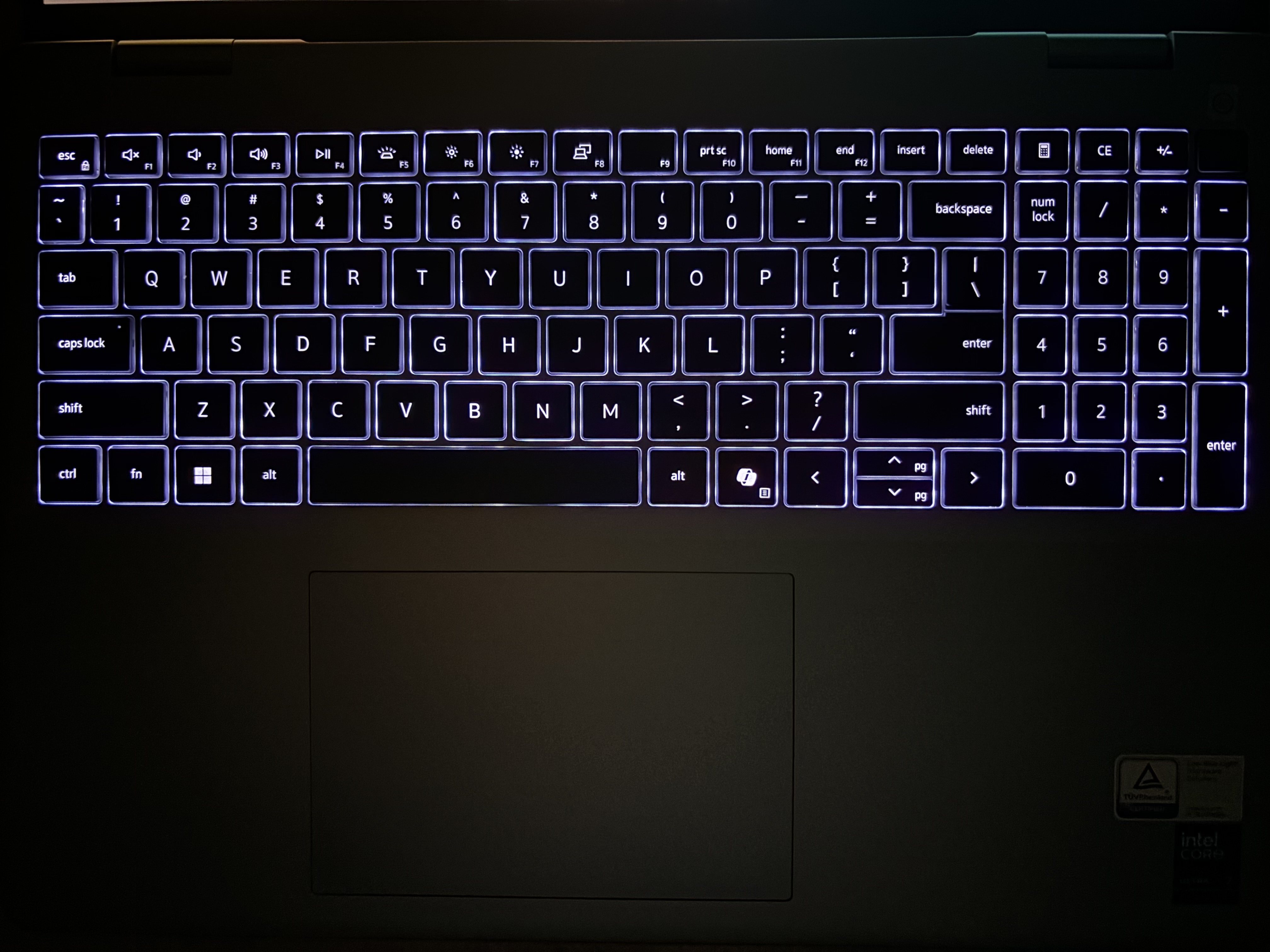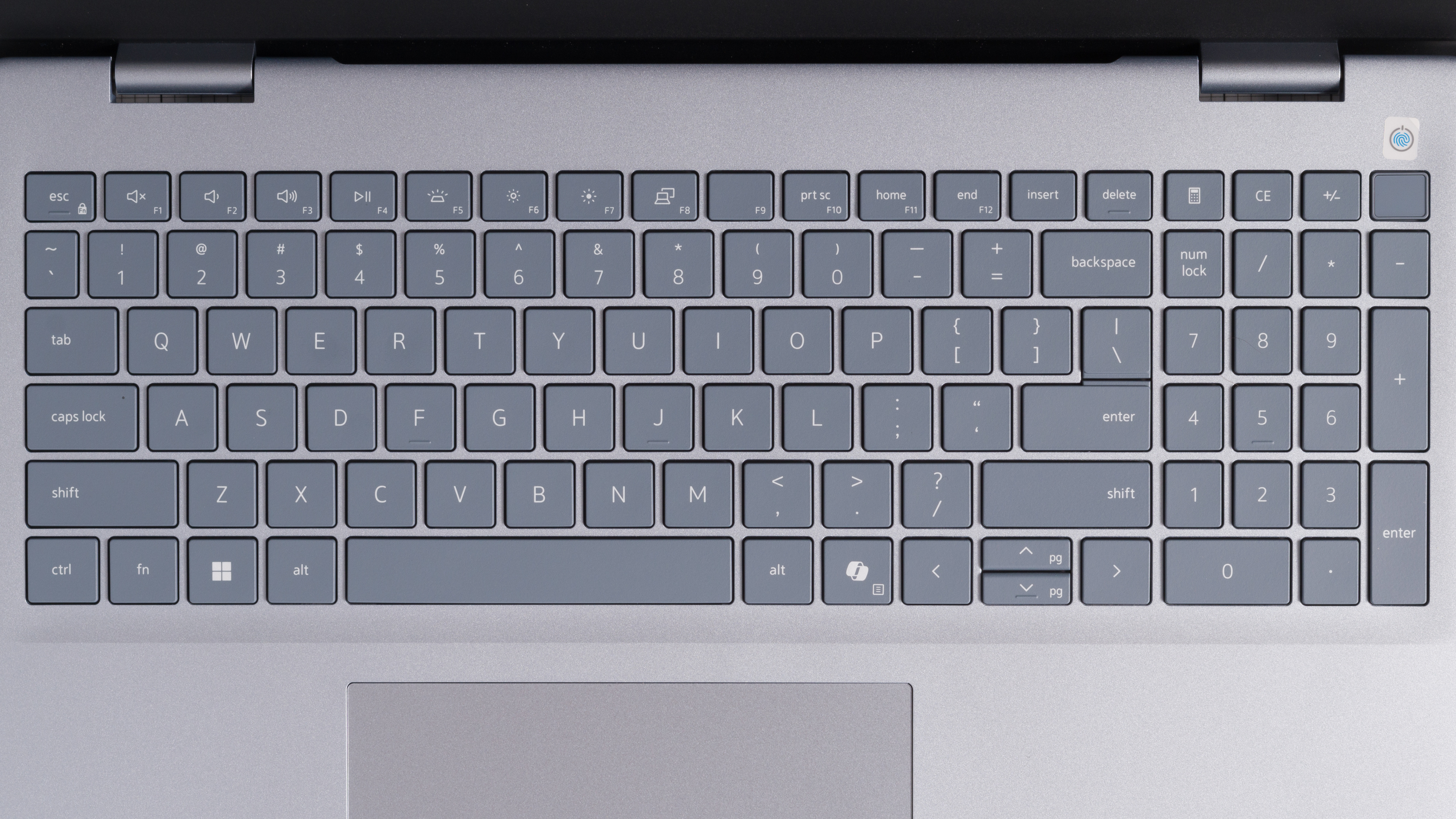 The Dell 16 Plus has a decent keyboard. Its layout feels spacious and is relatively easy to get used to. The keys have a decent amount of travel and tactile feedback; overall, the typing experience is satisfactory but not particularly noteworthy. There are two backlight brightness levels; the backlight shines well through the legends, but could be a tad brighter.