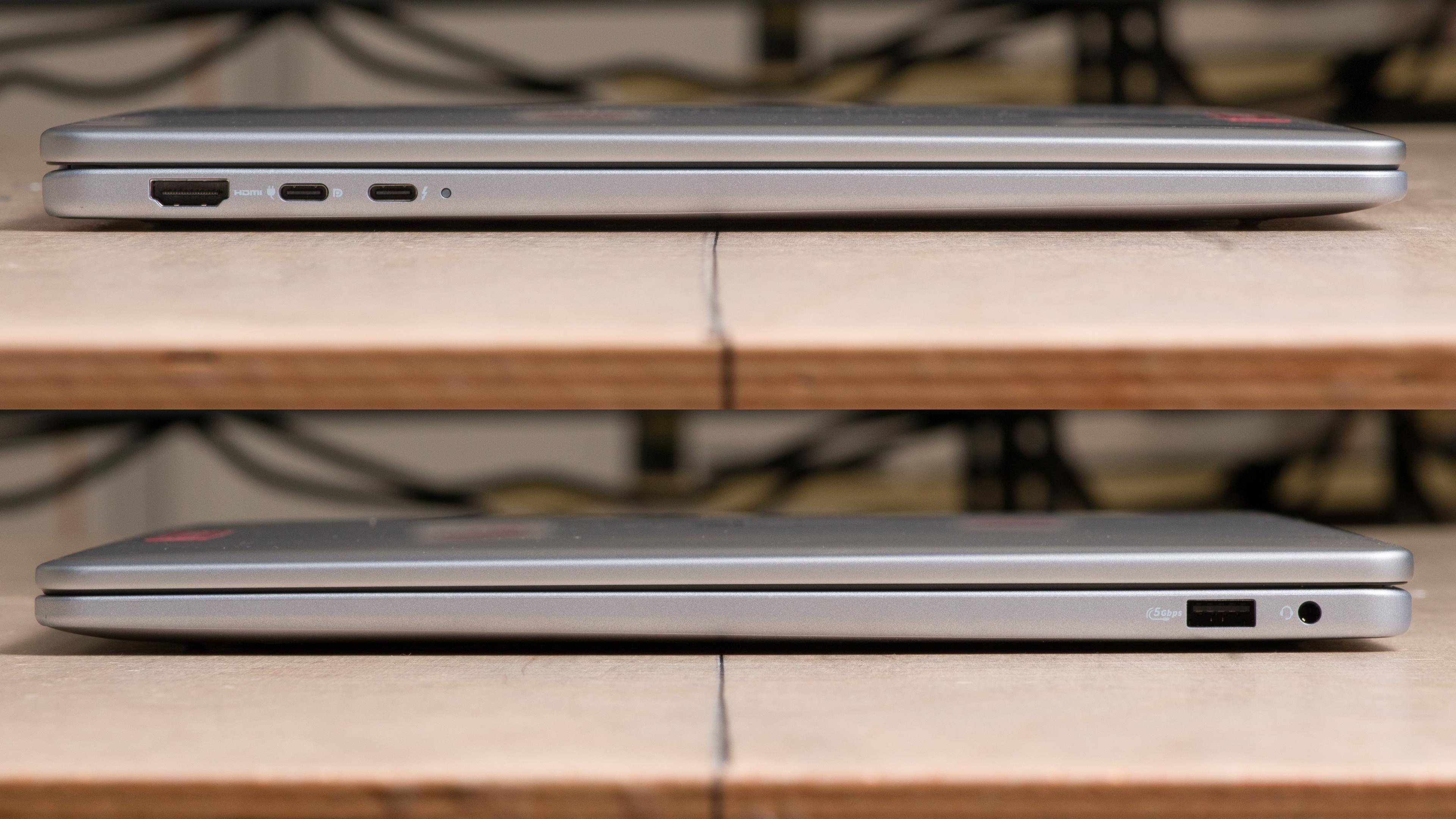 The hinges have a wide range that allows you to lay the screen flat, which is useful if you need to share content with someone opposite you. They're relatively stable; they move slightly when picking up the laptop quickly, though that isn't a significant issue in regular use. There's almost no wobble when adjusting the screen or when typing heavily.