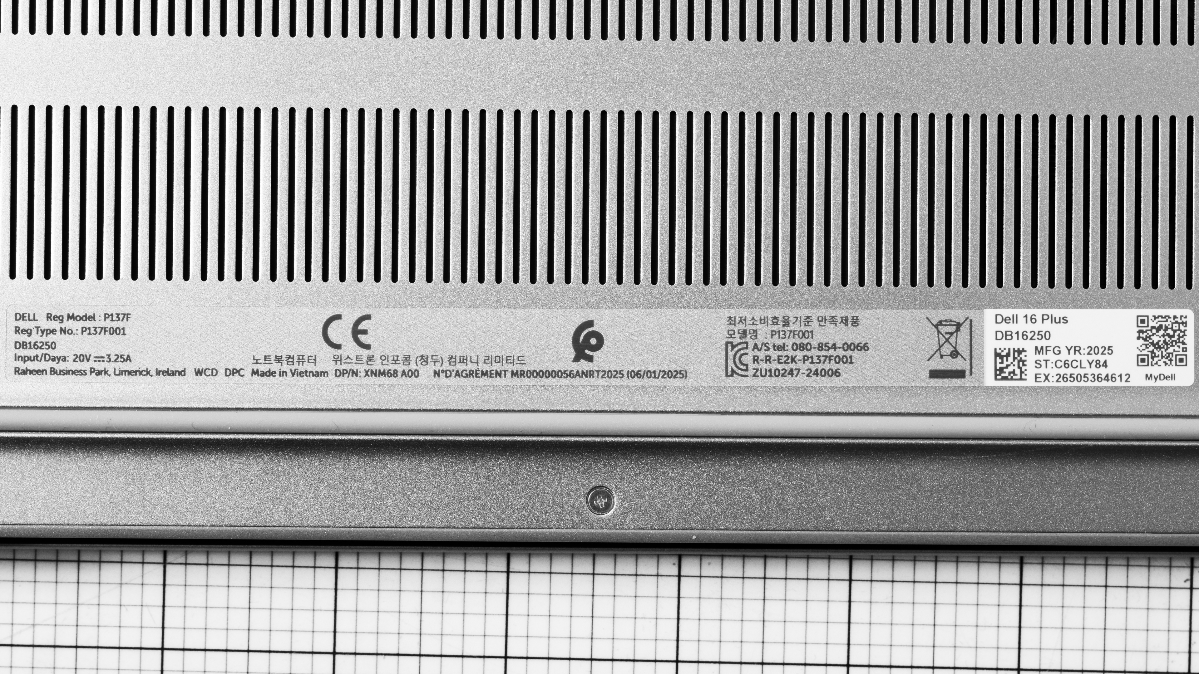 Accessing the Dell 16 Plus laptop's internals is easy; you only need to remove nine Philips screws and use a prying tool to release the clips holding the bottom panel. The two top corner screws are longer than the rest, but they're also captive, meaning they remain attached to the panel, so you don't have to worry about mixing them up with the other shorter screws. The storage slot supports M.2 2230 PCIe Gen 4 NVMe SSDs.