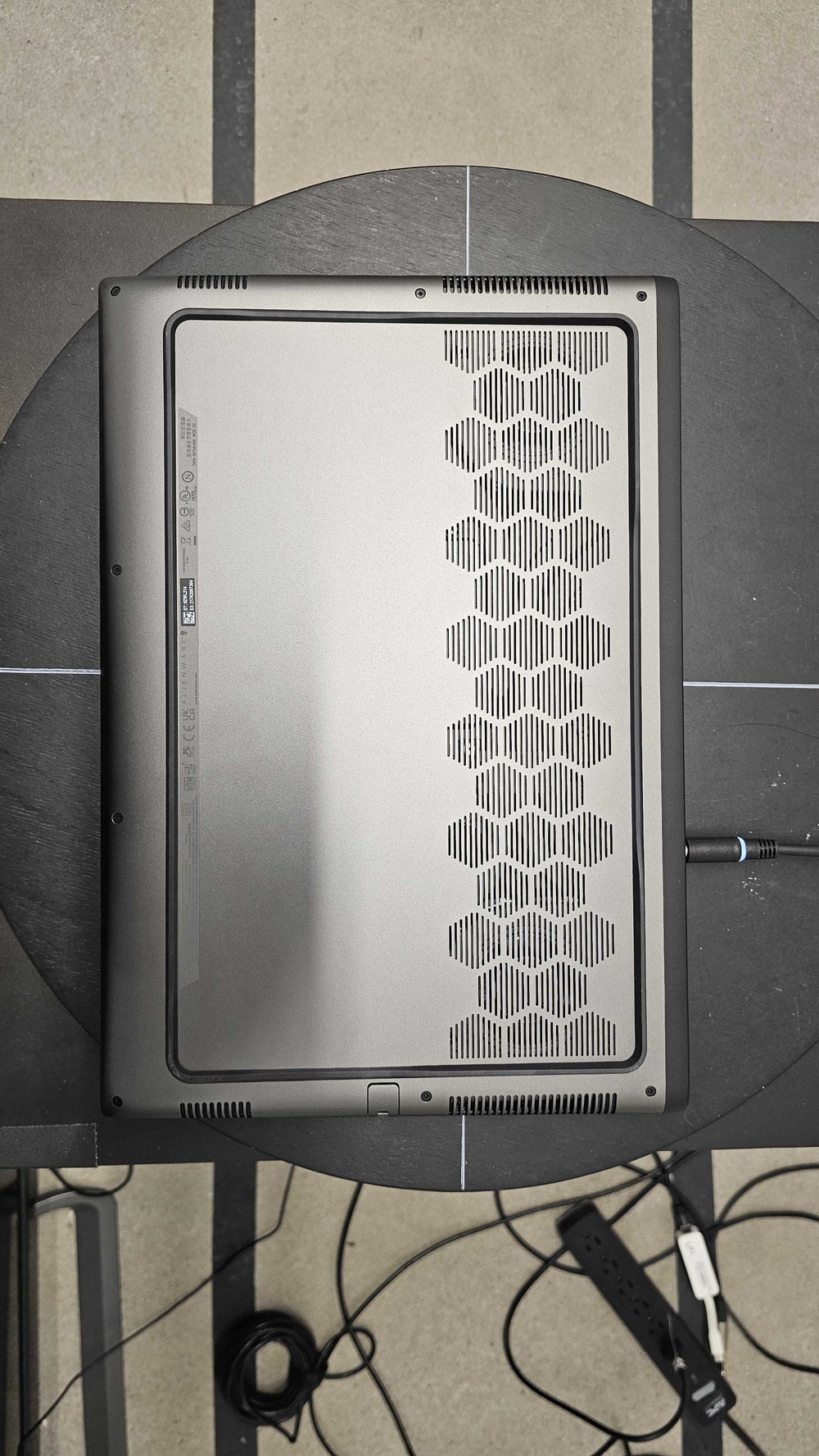 The Dell m16 R2 is only available in the Dark Metallic Moon color. Like its predecessor, the Dell Alienware m16 R1 (2023), the grills above the keyboard are air vents; the speakers are on the bottom near the front. See the bottom of the laptop here.