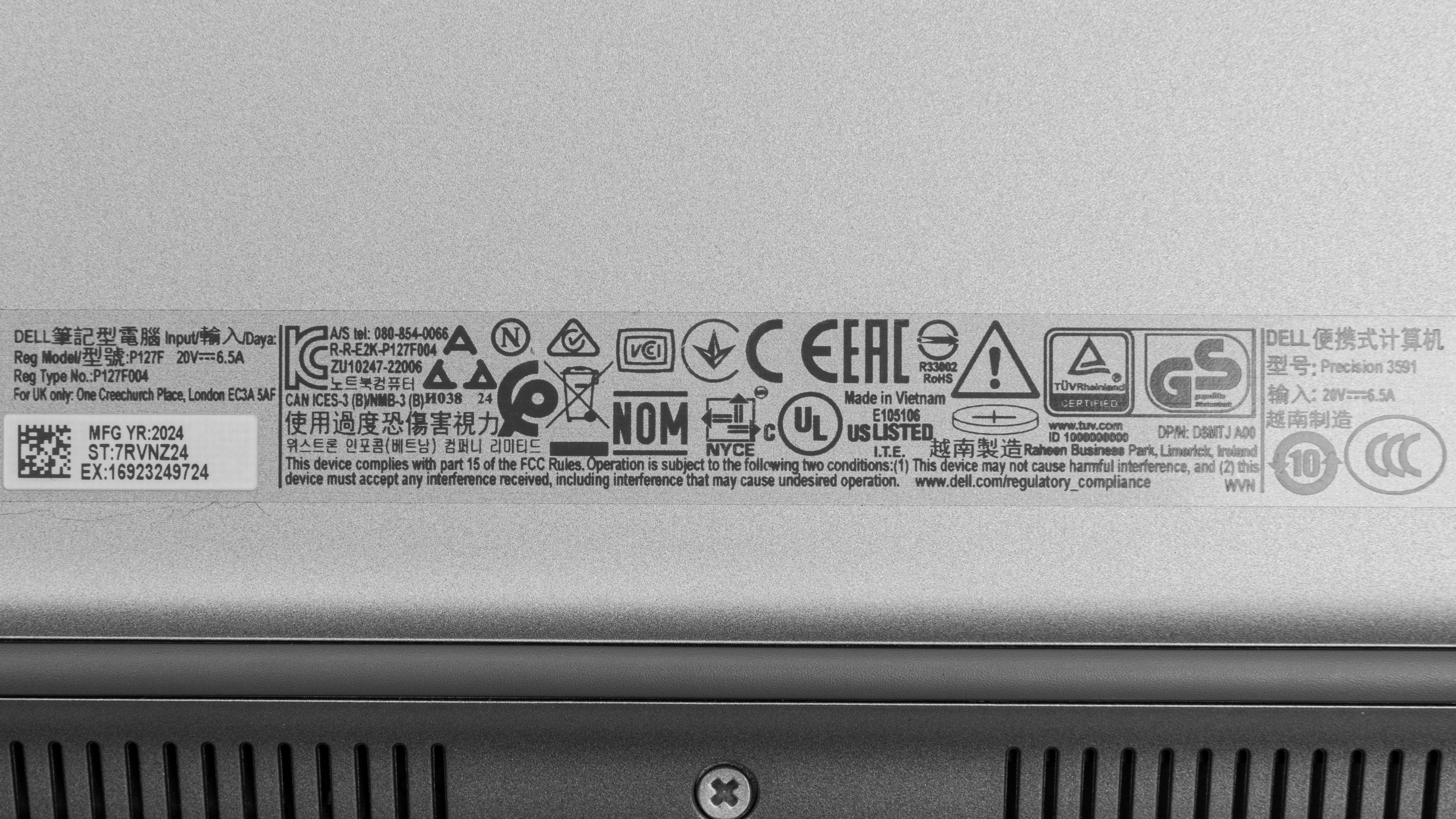 The Dell Precision 3591's serviceability is outstanding. Accessing the internals is very easy; you only need to remove eight Philips screws and release the bottom panel's clips with a prying tool. The screws are captive, meaning they remain attached to the bottom panel, so you don't have to worry about losing them. Both M.2 storage slots support 2230 and 2280 PCIe Gen 4 NVMe SSDs. The slot labeled 'MLK'—no, not that MLK—is for a WWAN adapter (cellular connectivity).