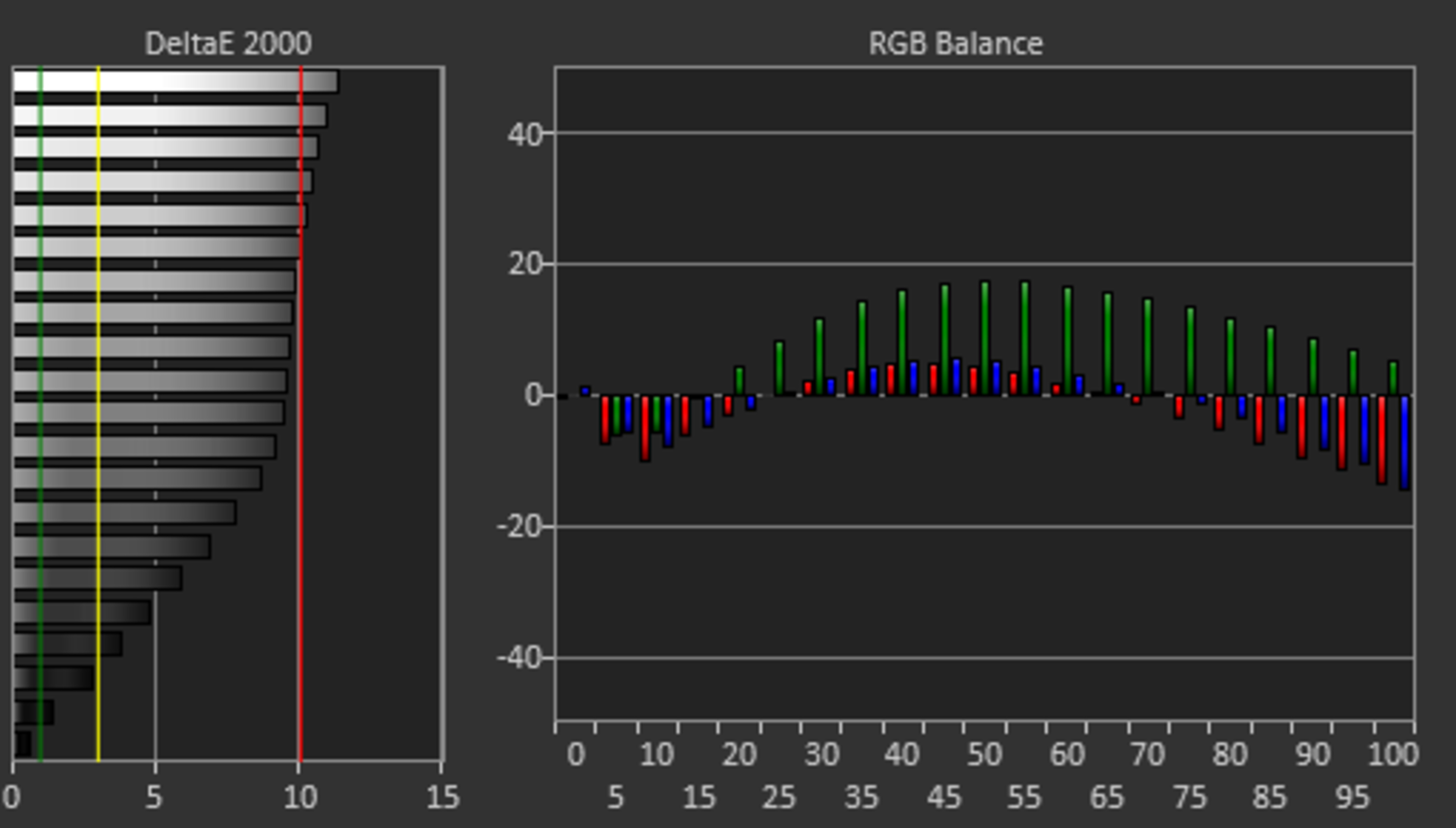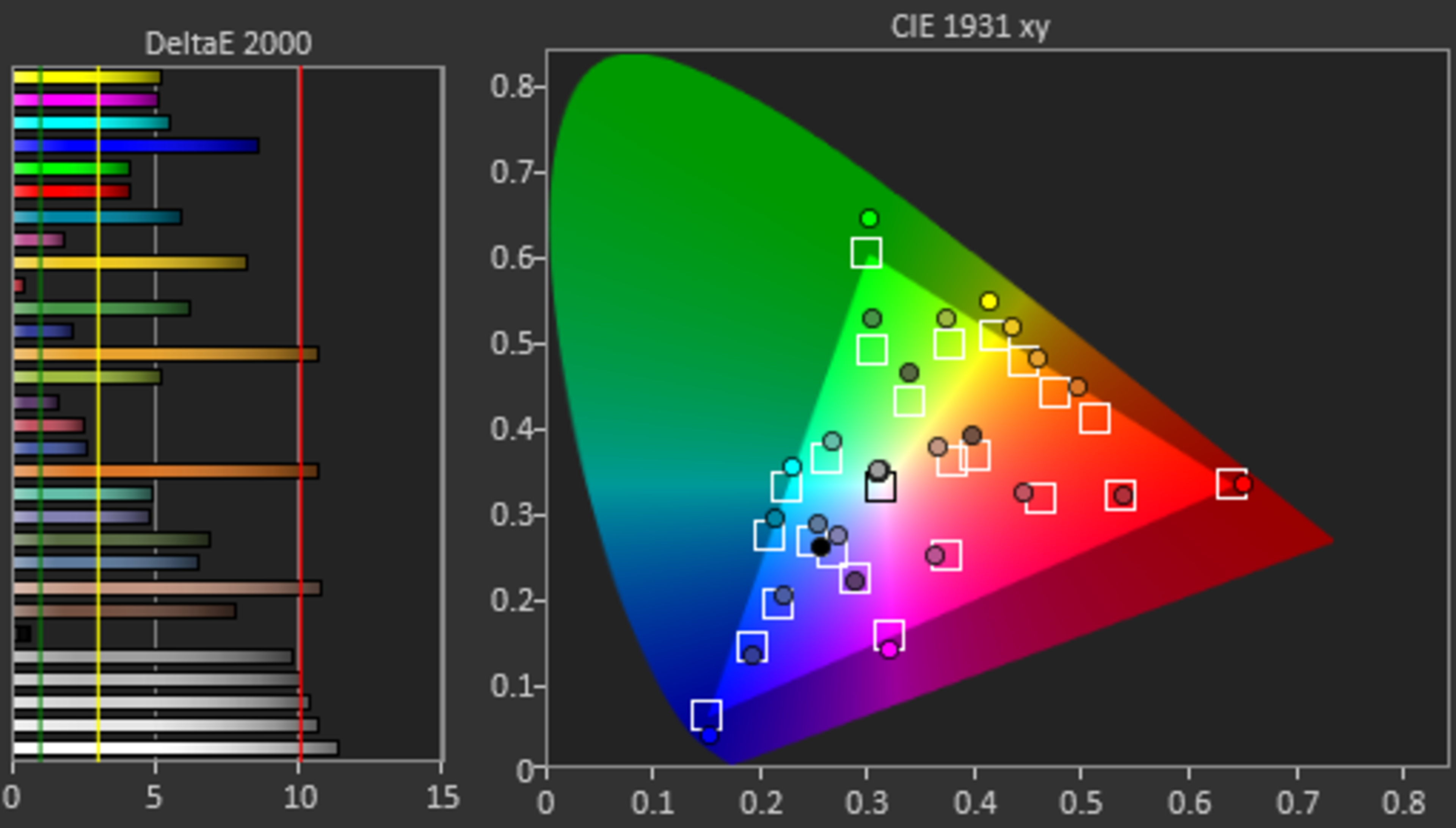 The 120Hz 2.8K display isn't as accurate, with a much higher white balance dE (too much green) and color dE. Here are the measurements: