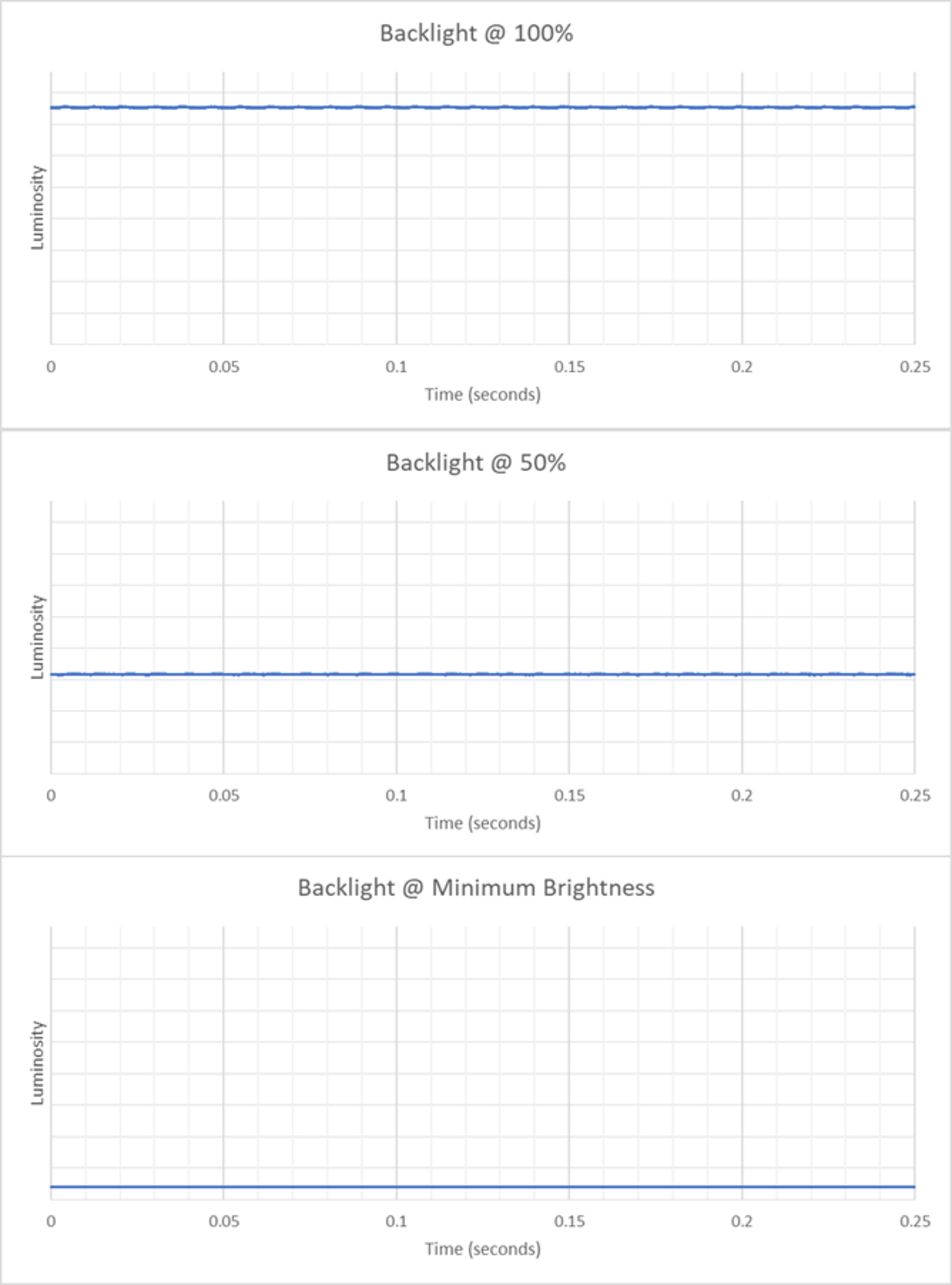 The 120Hz display also has a matte finish that performs similarly. Here are the measurements as well as the photos with the screen off and at max brightness.