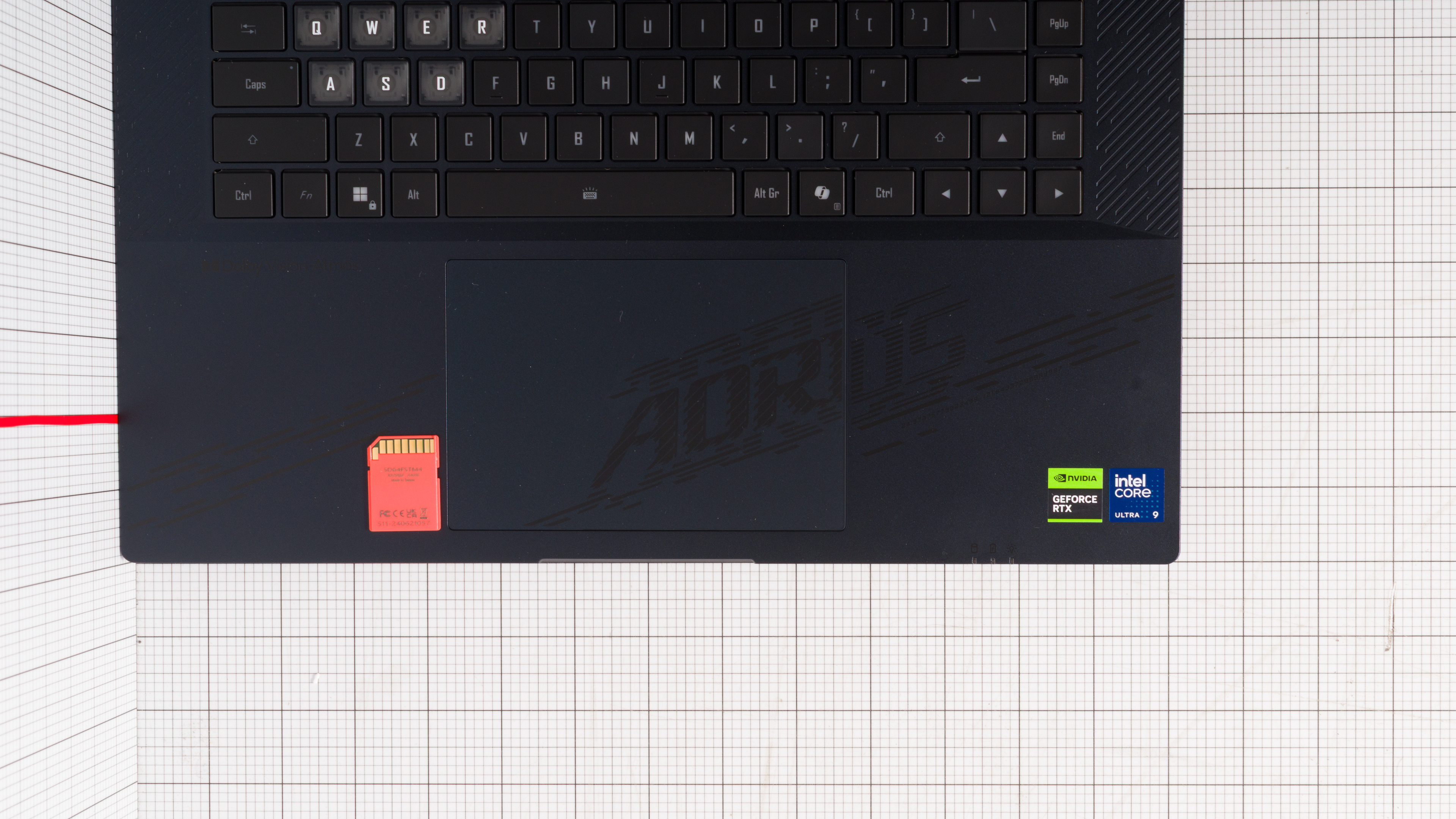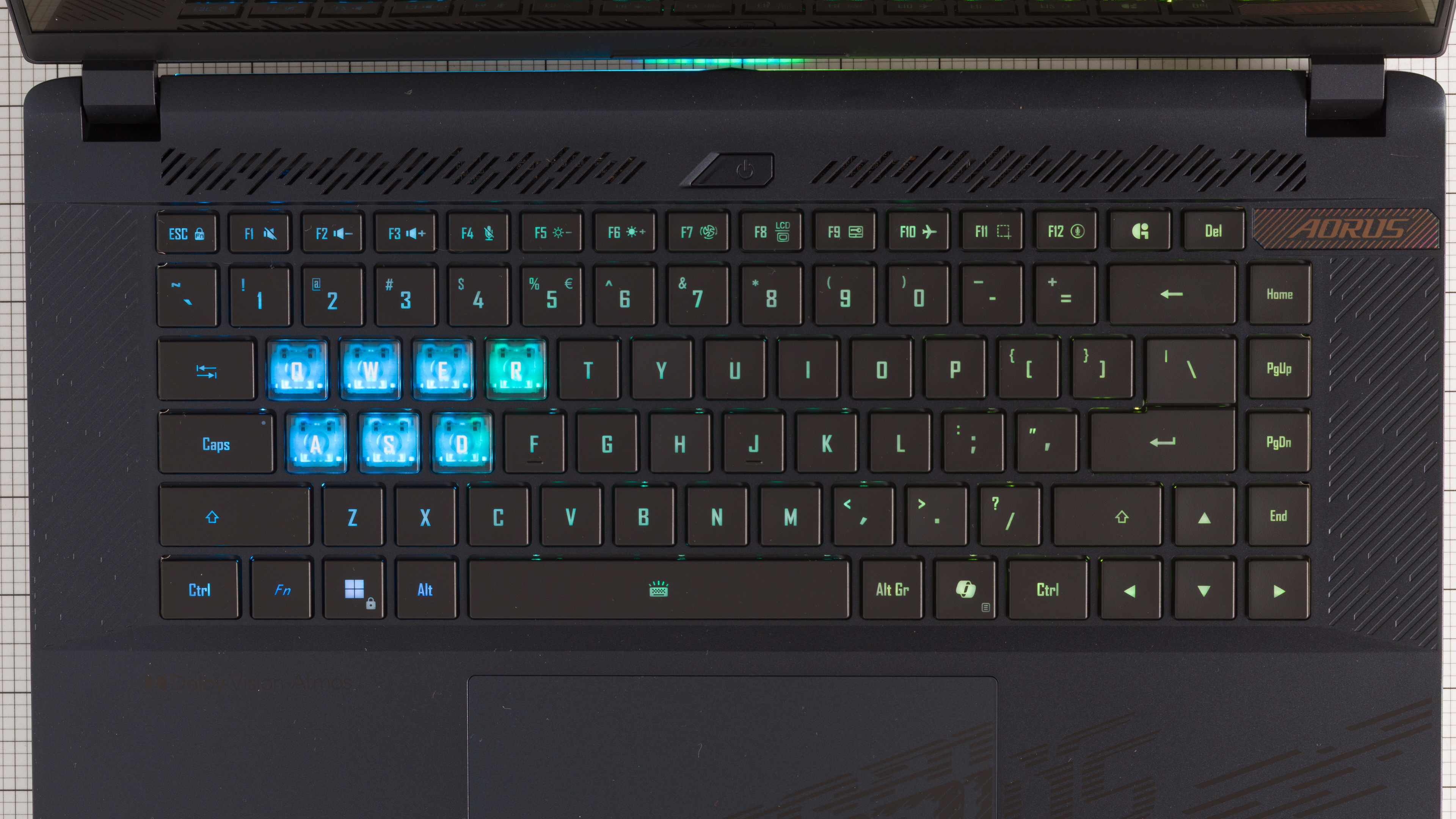 The Gigabyte AORUS MASTER 16 has a great keyboard. Its layout feels spacious and is relatively easy to get used to. A tad more spacing between the navigation keys on the right and the rest of the keys would have been preferable, as it would make it easier to locate the arrow keys without having to look at the keyboard. The keys have a good amount of travel, are easy to actuate, and provide satisfying tactile feedback. There are three RGB backlight zones; you can customize the colors and effects via the pre-installed GiMate software.