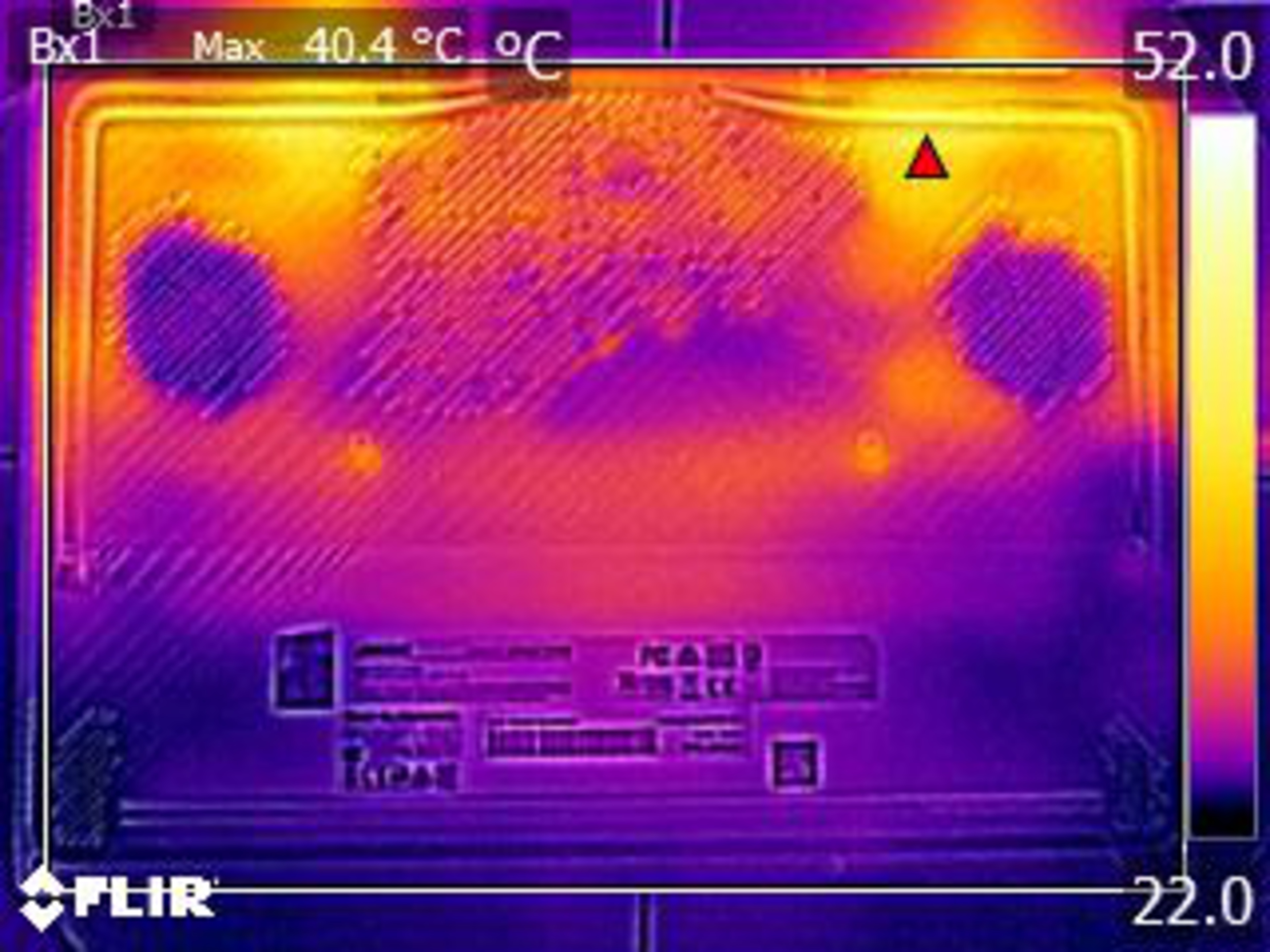 The keyboard gets quite warm under load, but it isn't hot enough to cause major discomfort. The bottom of the laptop is much cooler at 40.4 °C (104.72 °F), so you shouldn't have any problems using the device on your lap. Unfortunately, the fans are extremely loud.